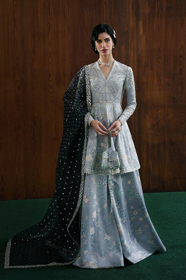 - Mercury grey printed velvet peplum with heavy embroidery on body and border. Full, fitted sleeves with embroidery and handwork.