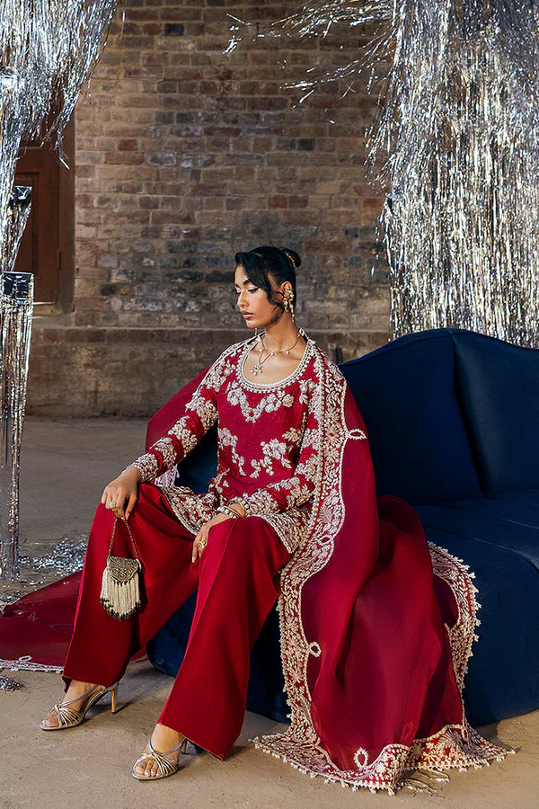 - Cherry Red mid-length shirt made of raw silk with a moon neckline. The shirt features intricate handwork and ornamentation throughout, with the embroidery creating a flourish at the hem. It has fitted sleeves that are adorned with lace and decorative pearls.