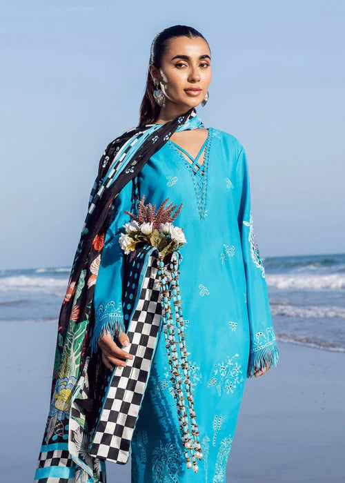 "Embroidered lawn front - 0.88 yard Embroidered lawn back - 0.88 yard Embroidered lawn sleeve - 0.72 yard Dyed woven cambric trouser - 2.7 yard Digital Printed silk dupatta - 2.7 yard"