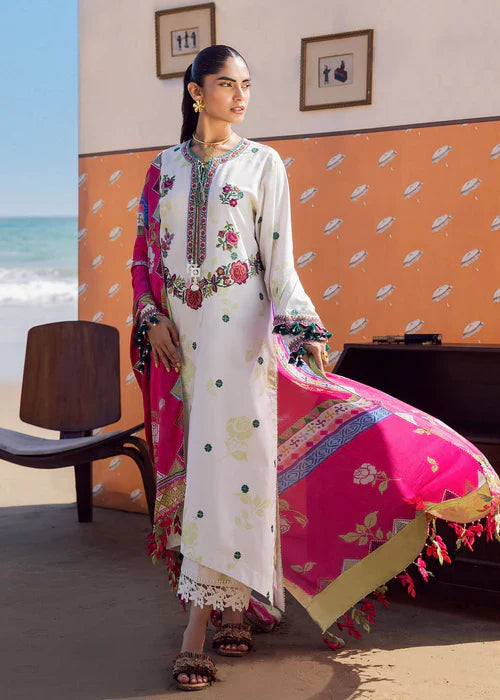 "Embroidered digital printed lawn shirt - 3.8 yard Embroidered organza neckline patch - 1 pc Embroidered organza neck motif - 4 pc Embroidered organza front border - 52"" Embroidered organza sleeve border - 45"" Digital Printed cambric trouser - 2.7 yard Digital Printed silk dupatta - 2.7 yard"