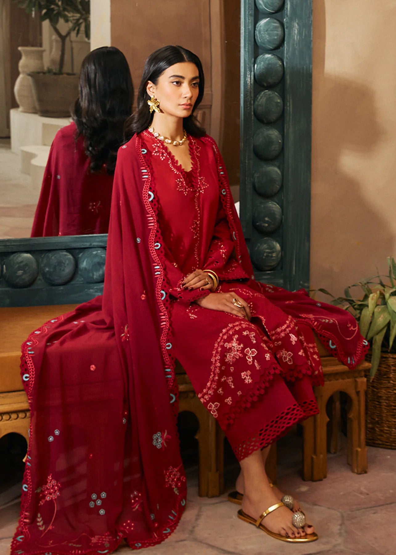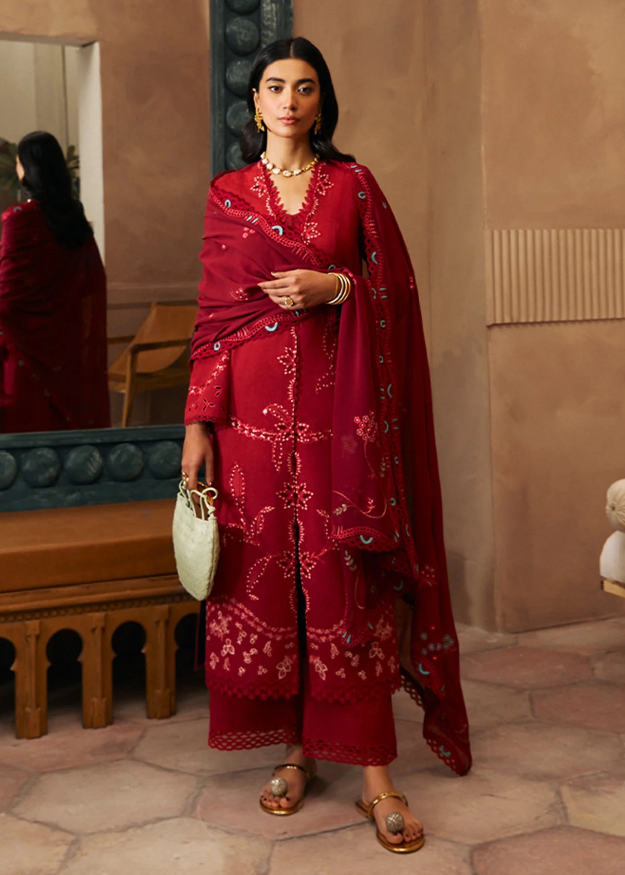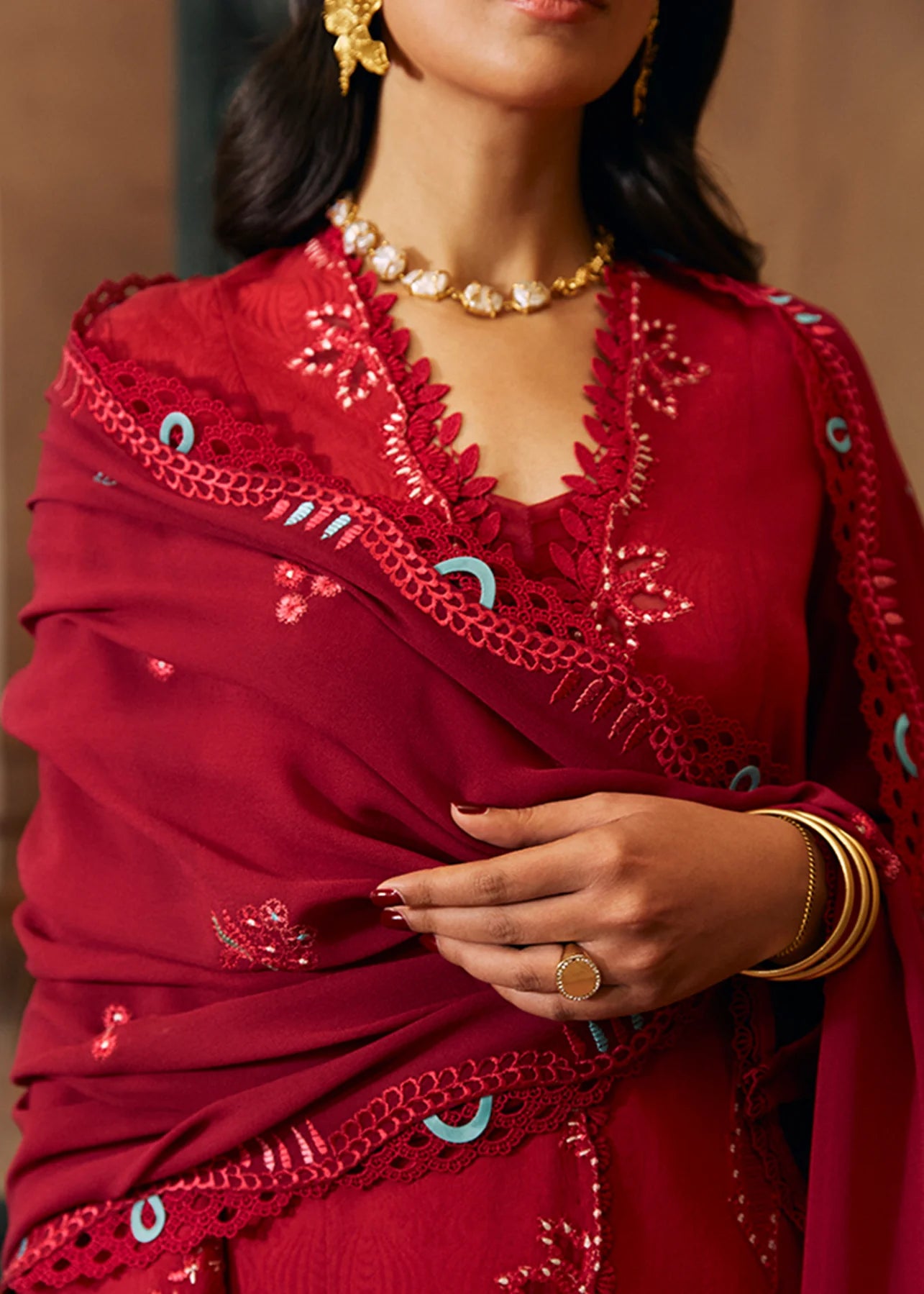 - Berry red panelled textured lawn, front opened overlapped silhouette with a U-shaped neckline. Embroidered and laser-cut details. Bell sleeves with embroidery and details.