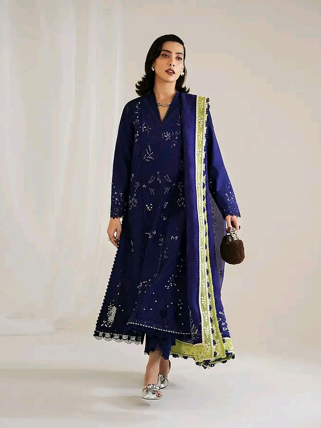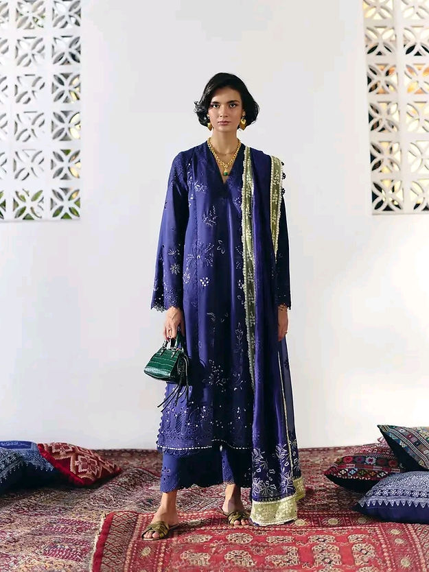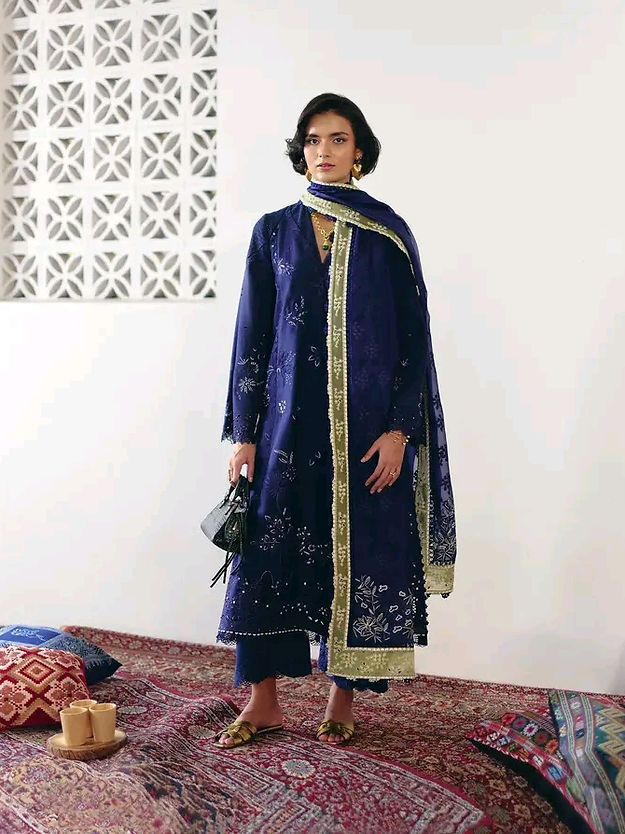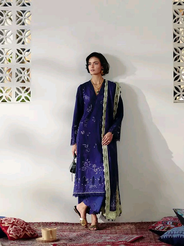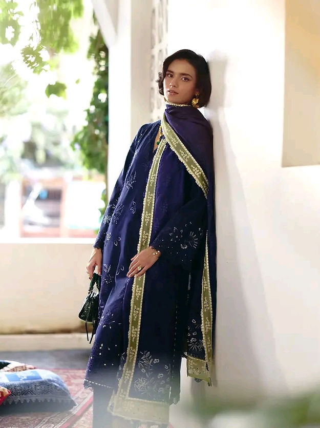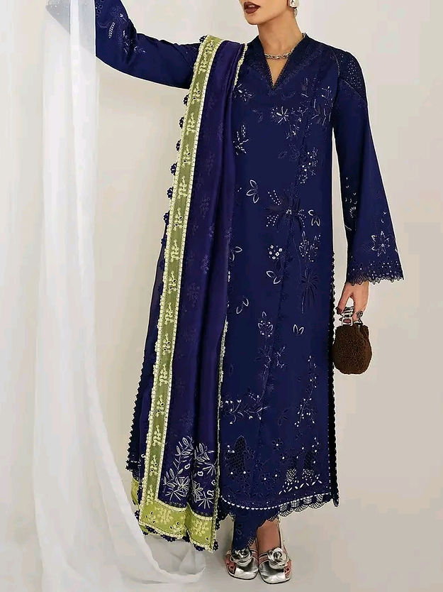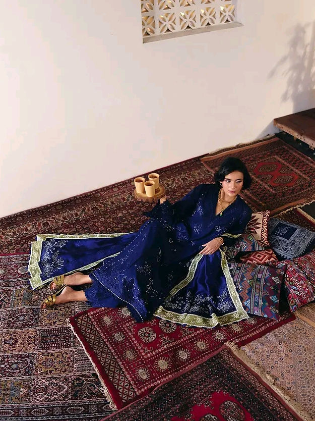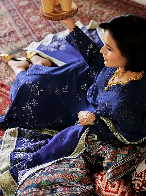 Indigo blue pure cotton, jacquard shirt with cutwork details on V-Neckline and sleeves. Sleeves are bell shaped with lacework details and the outfit is enhanced with embroidery and applique work.