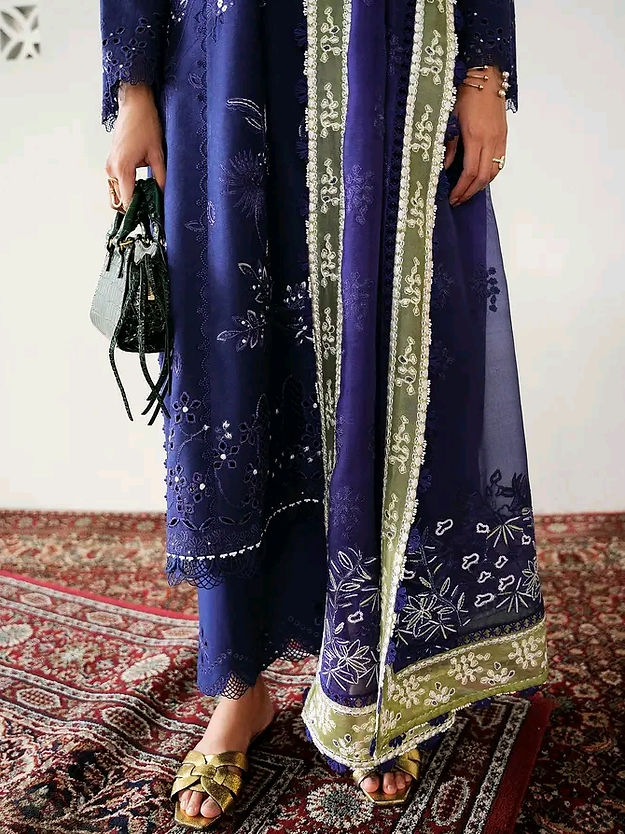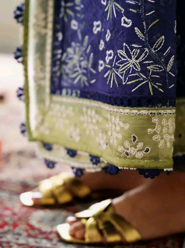 Dual colour, organza dupatta. A border of lime green in organza contrasted by the central indigo blue. The dupatta is enhanced by lacework and contrast embroidery.