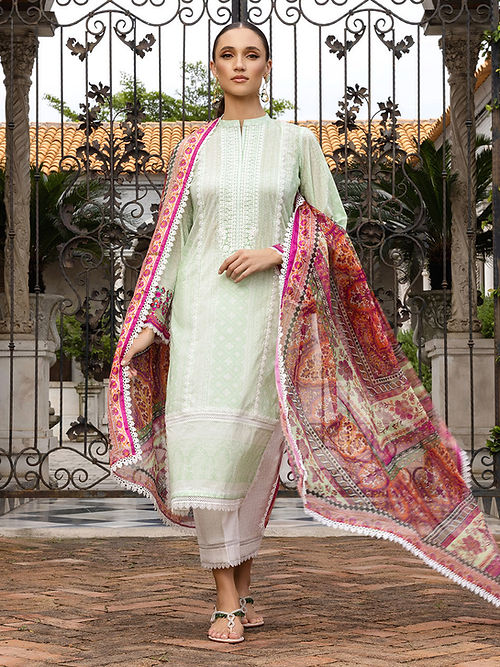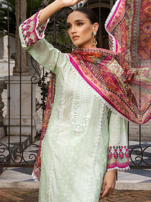 Step Into The Realm Of Elegance With This Exquisitely Crafted Silhouette Adorned In Breezy Mint Green Hues.A Gracefully Printed Dupatta Adds An Extra Touch Of Sophistication To The Overall Attire.