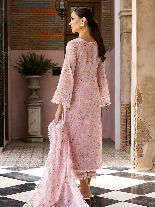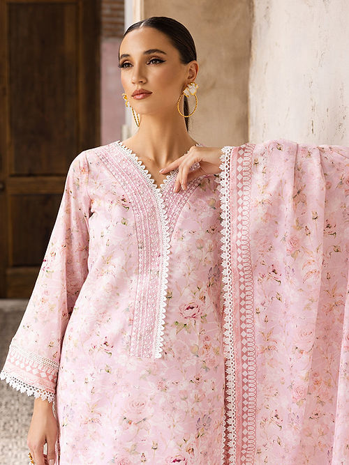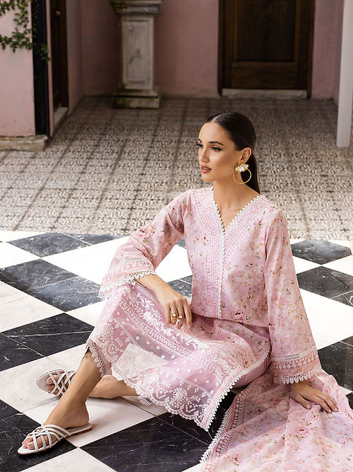 Presenting An Exquisite Monochrome Printed Ensemble In A Refreshing Powder Pink Tone, Adorned With Delicate Floral Prints And Elegant Embroidery Borders, Complementing The Summer Vibes!