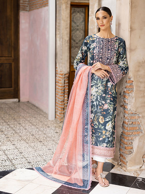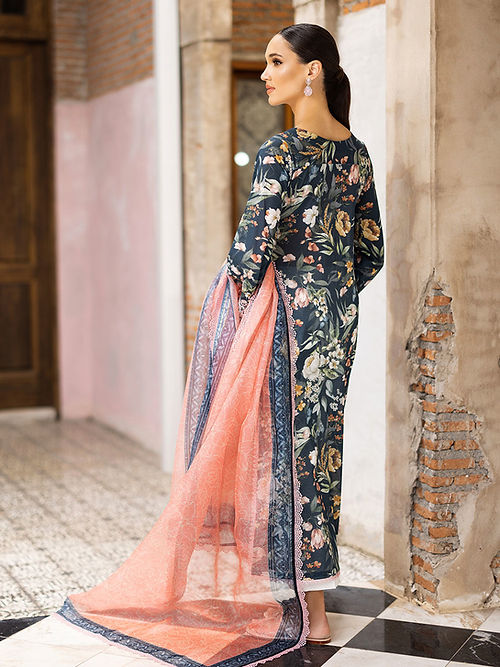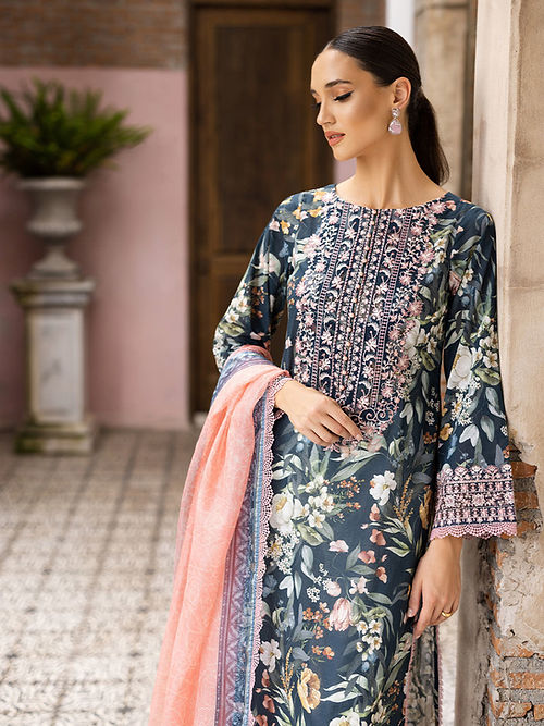 Embrace The Essence Of Summer With This Beautifully Designed Exotic Printed Ensemble. The Outfit Features An Embroidered Neckline And A Soothing Salmon Pink Dupatta, Adding A Playful Touch Of Tropical Flair To Your Look.