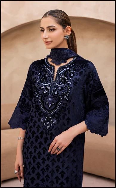 A symphony of elegance and opulence, Navy Serenade is a 3-piece velvet ensemble that radiates regal sophistication. Crafted in a majestic midnight blue hue, this masterpiece features an intricately embroidered neckline adorned with glistening hand embellishments and sequins that catch the light with every movement. The plush velvet canvas is elevated with ornate cutwork and lace detailing, blending traditional artistry with contemporary finesse. Paired with a gracefully draped dupatta, this ensemble exudes timeless grandeur — an ode to refined luxury, perfect for winter soirées and festive celebrations.