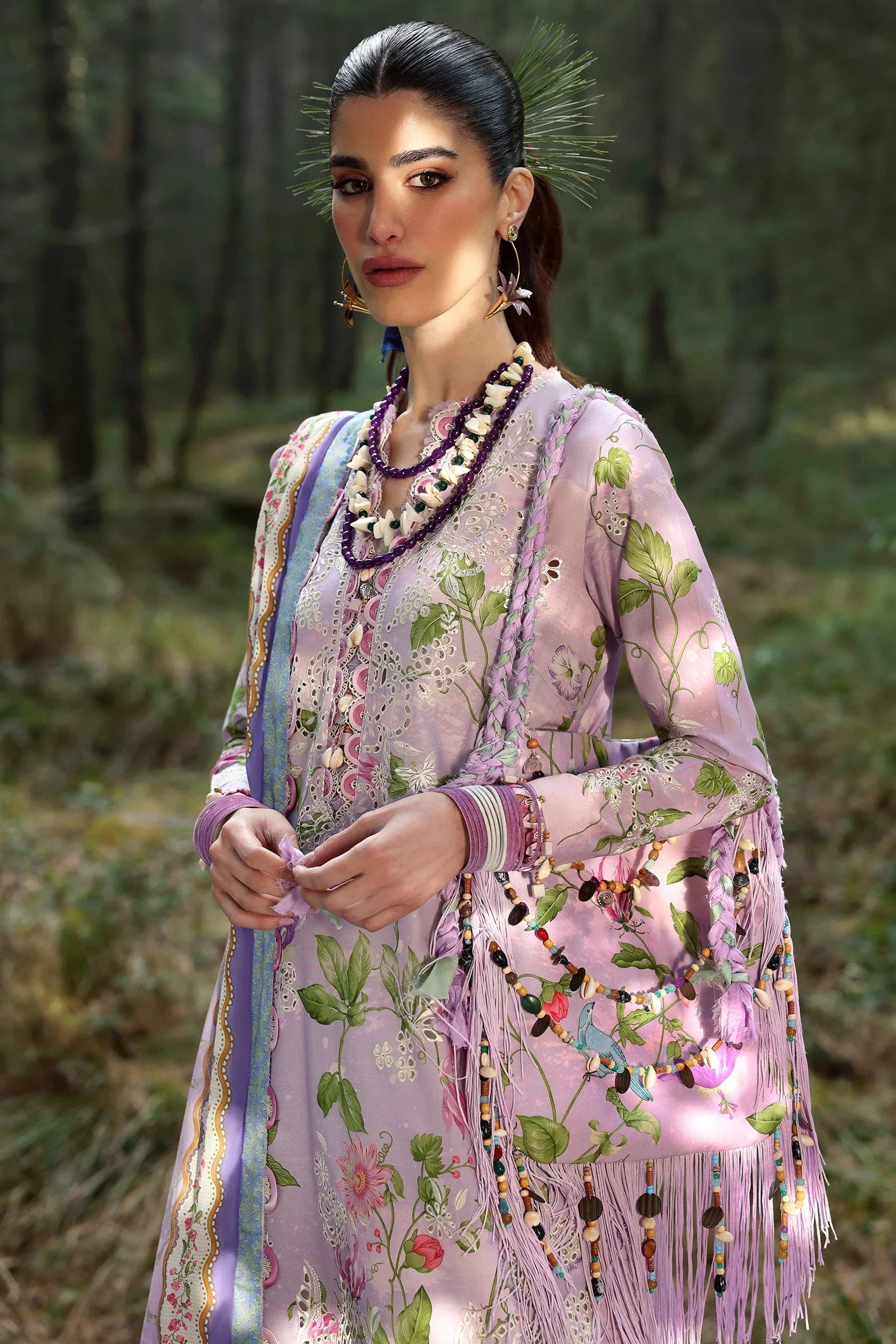 Set against a lush green backdrop, Elara comes to life in a refreshing lilac hue, embodying effortless summer chic. Delicate ivory and green leafy florals sprawl across the breezy canvas, exuding a perfect blend of sophistication and playfulness. Intricate Schiffli details and fine embroidery grace the neckline and hem, adding texture and refined charm. With its sleek, modern silhouette and airy fabric, this ensemble is made for sun-drenched garden parties, stylish brunches, and every moment in between. A statement in effortless elegance, designed for the Zaha girl who knows how to keep it fresh, fun, and undeniably trendy.