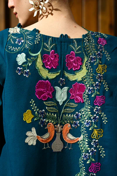 This three-piece article, crafted from luxurious Zinc Karandi, presents a stunning jewel-toned ensemble perfect for the winter season. The deep Teal/Peacock Bluebase fabric is lavishly adorned with vibrant, multicoloredfloral embroiderythat covers the front of the long shirt and extends beautifully onto the matching shawl. This intricate thread-work features shades ofmustard yellow, fuchsia/deep pink, lime green, and royal blue, creating a lush, garden-like motif that is both rich and traditional. The set is completed with coordinating straight trousers, which feature subtle textured detailing or a patterned border near the cuff, ensuring a cohesive and elegantly detailed look ideal for formal occasions.