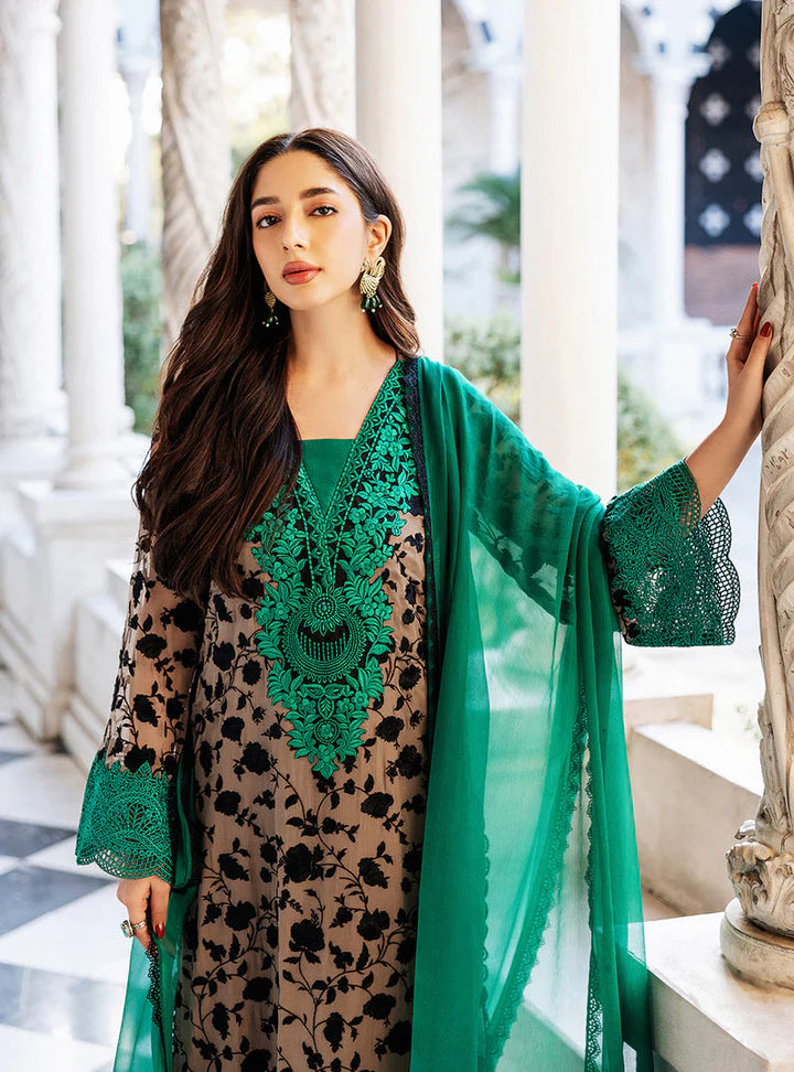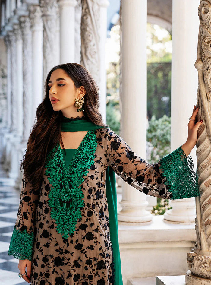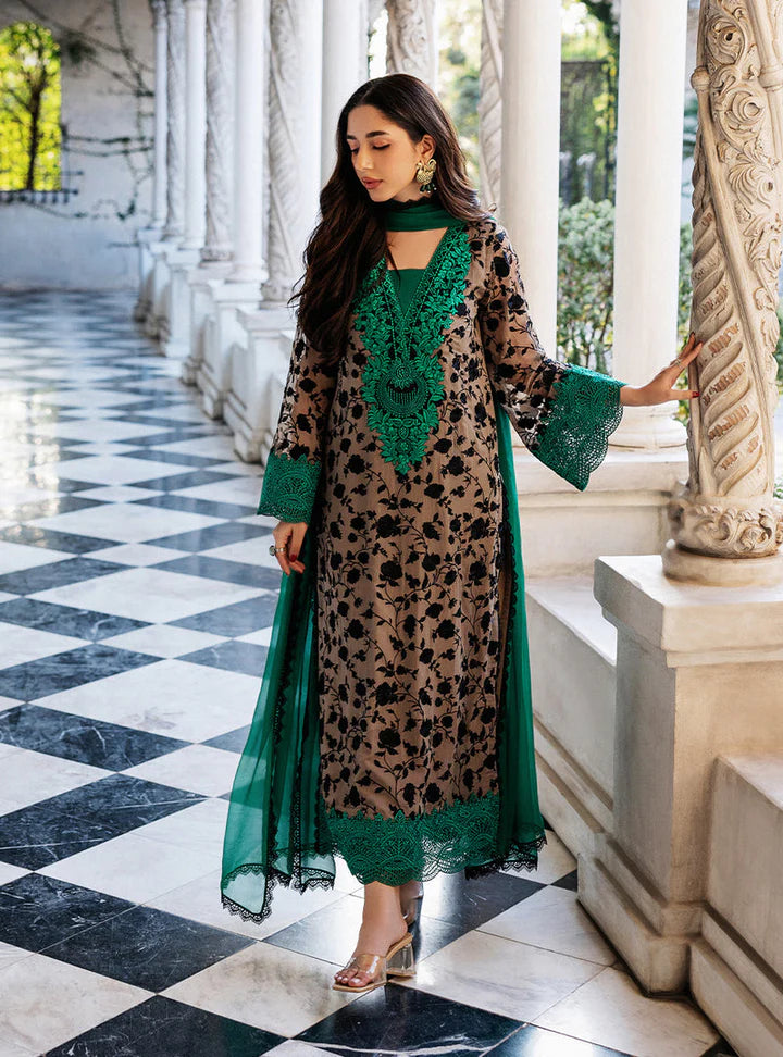 This elegant ensemble features a coffee-colored chiffon shirt adorned with intricate black embroidery all over. The emerald green embroidered neckline, sleeves, and hemline create a captivating arabesque pattern. Paired with luxurious viscose pants and a flowing pure chiffon dupatta finished with delicate lace, this outfit exudes an aura of sophistication and timeless elegance. It is a true testament to the artistry of design and the allure of refined fashion.