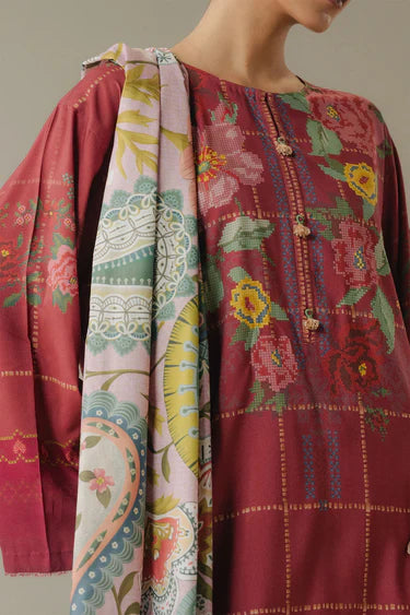 A rosewood shirt inspired by intricate cross-stitch embroidery, paired with matching rosewood trousers for a refined, monochromatic look. The outfit is elevated with a bold, colorful paisley shawl that adds vibrance and a touch of artistic flair, creating a perfect balance of tradition and contemporary charm.