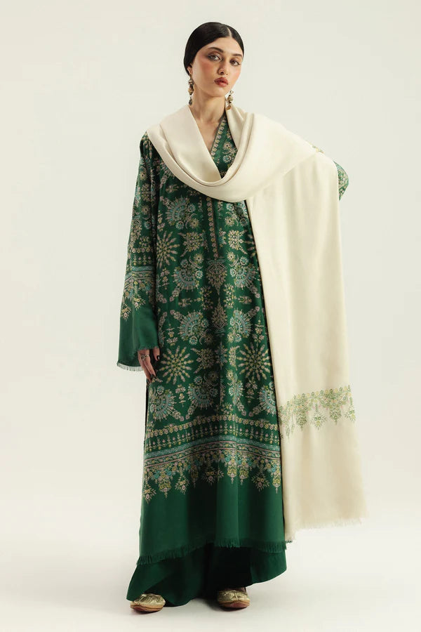 A green marina shirt featuring all-over embroidery on the front and back, showcasing fine craftsmanship and elegant detail. Paired with a contrasting ivory marina shawl embroidered on the pallus and matching marina trousers, this ensemble combines rich color with timeless sophistication.
