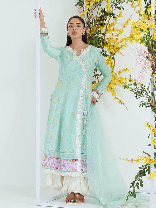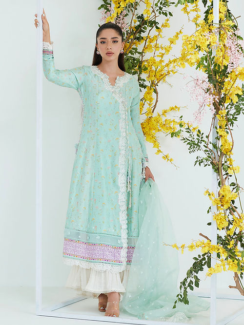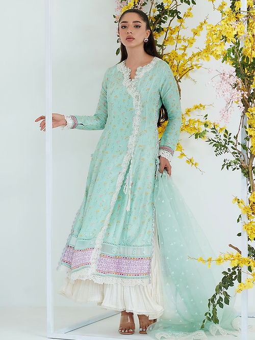 A contemporary uber-flattering silhouette, with an overlapping neckline and scattered embroidered border with handmade pearl tassels. The angarkha style of the shirt is made to endlessly flatter everyone who wears this utterly captivating outfit.