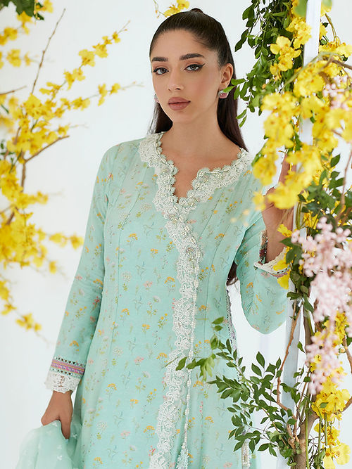 Embrace the simple elegance of the design and pair with pure crushed pants and sequenced organza dupatta (as shown)