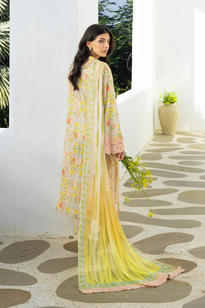 Echoing the warmth of a gentle summer bloom, a soft peach jacquard lawn shirt is adorned with an English garden inspired floral print in apricot, butter yellow, and fresh green tones. Delicate embroidery and eyelet detailing trace the neckline and extend along the sleeves, while fine linear threadwork adds subtle texture through the length of the shirt. Matching printed jacquard lawn culottes complete the look. The ensemble is paired with a sheer chiffon dupatta in soft chartreuse gradients, adding a cheerful finish.