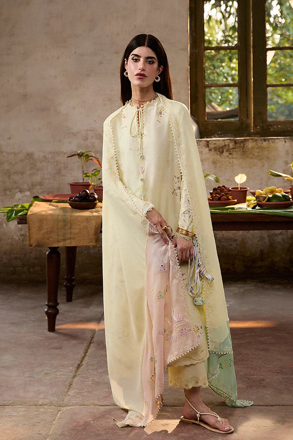 Gradient chiffon dupatta blending butter-yellow, pink, and green with embroidery accents and lace edging on all sides.