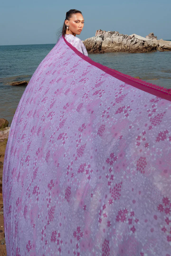 This lilac ensemble blends elegant embroidery with soft prints featuring a graceful chiffon dupatta and a structured cotton trouser timeless and effortlessly chic.