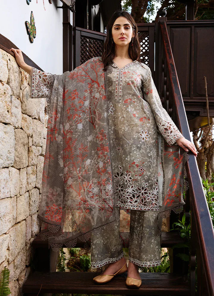 Anisa in Stone Grey from our Spring Printkari '25 Collection. A printed cutwork embroidered cotton 3-piece outfit paired with digital printed chiffon dupatta.