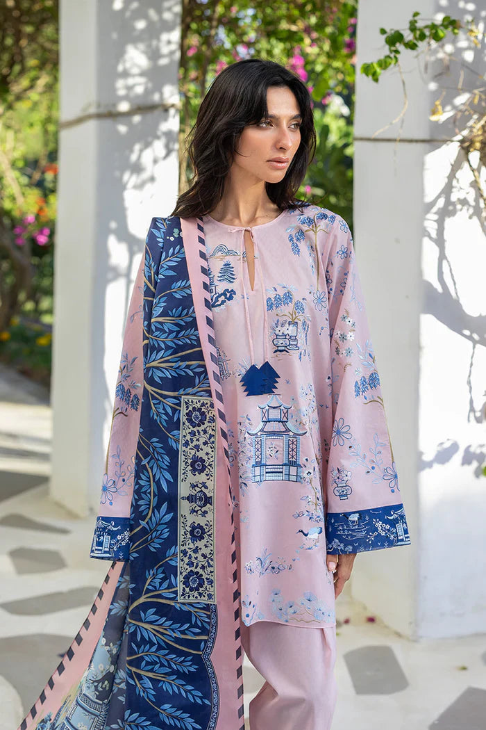 Echoing the charm of a pastoral landscape, a pastel pink jacquard lawn shirt is adorned with toile inspired scenic embroidery in shades of cornflower and soft navy, depicting architectural and pastoral motifs in a balanced composition. Contrasting cerulean cuffs lend definition to the silhouette. The ensemble is paired with a matching jacquard cotton shalwar, finished with embellished scalloped hem. A statement medium silk dupatta in layered tones of deep navy, aqua, and lilac completes the look with an intricate scenic and botanical print.