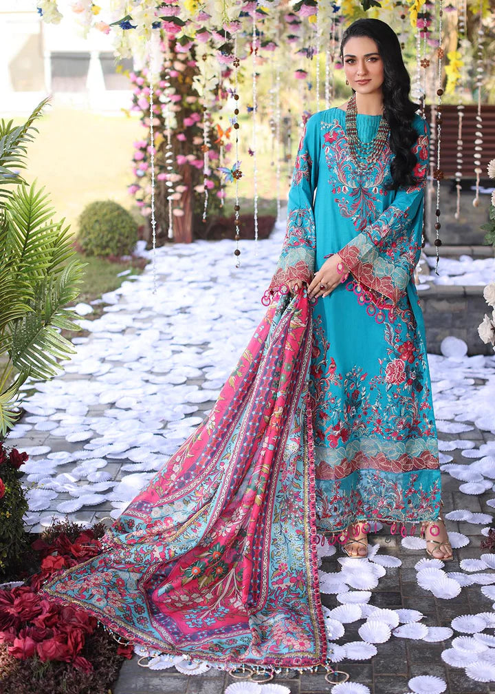 Celestia is a breathtaking ode to elegance, radiating in a captivating teal hue. The shirt is adorned with vibrant Resham and tilla embroidery, featuring exotic floral motifs, while double embroidered organza borders add a touch of refined artistry. The fully embroidered sleeves, finished with tilla organza borders, enhance the ensemble’s sophisticated appeal.