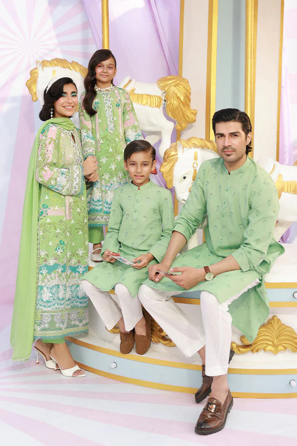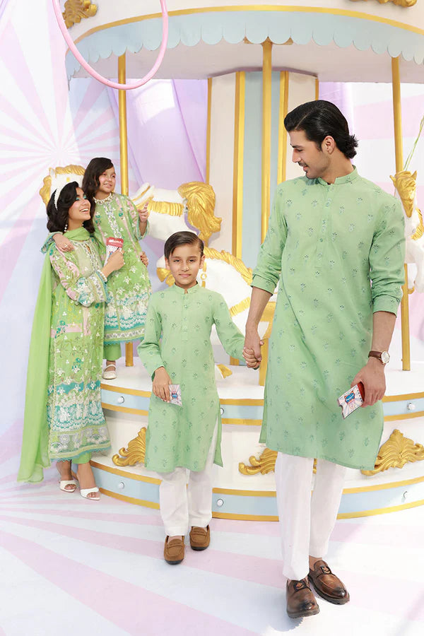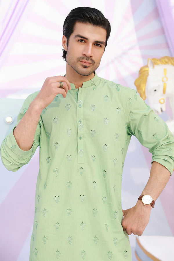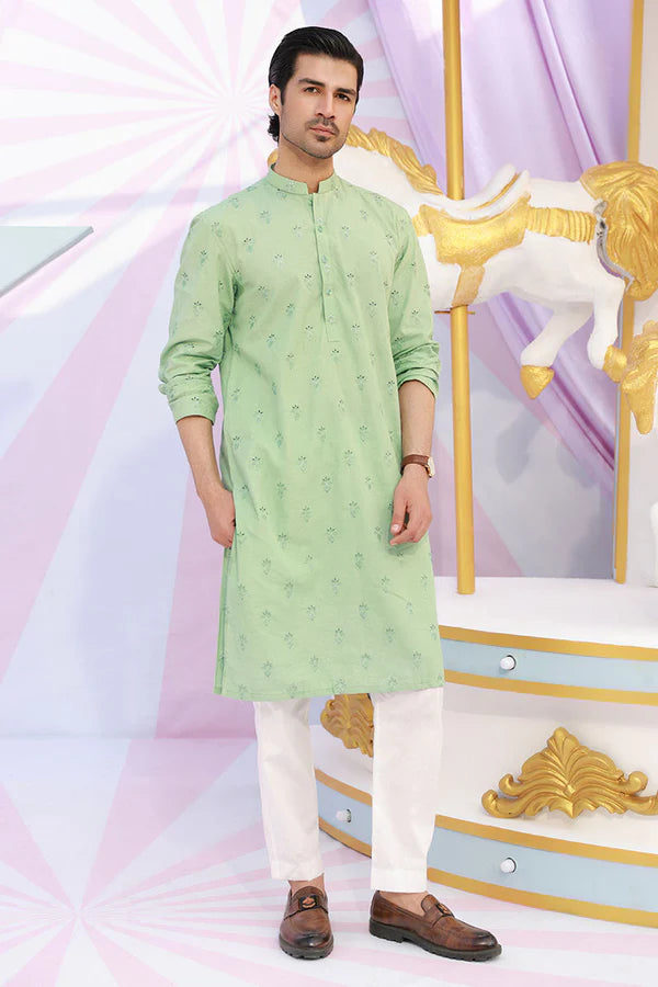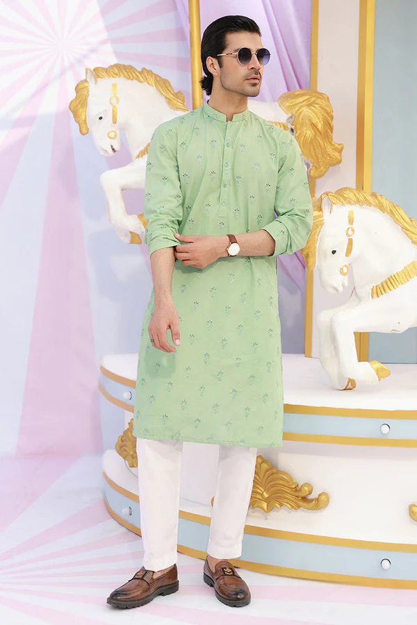 A Green self embroidered kurta on cotton with white bareeze cotton straight pants.