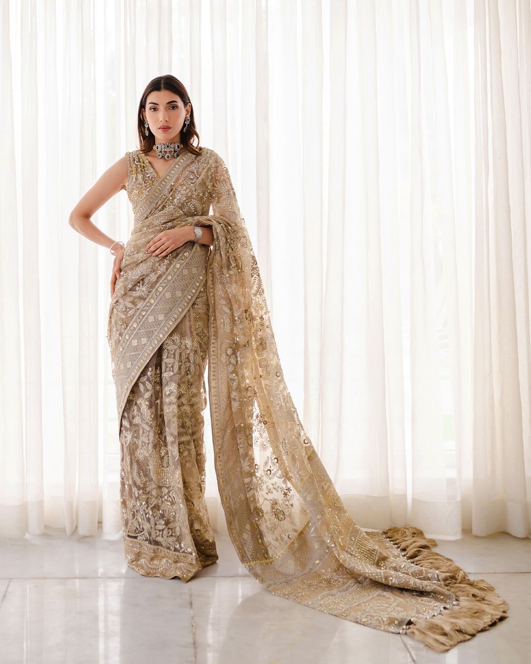 - Embroidered And Hand Embellished Net Upper Panel