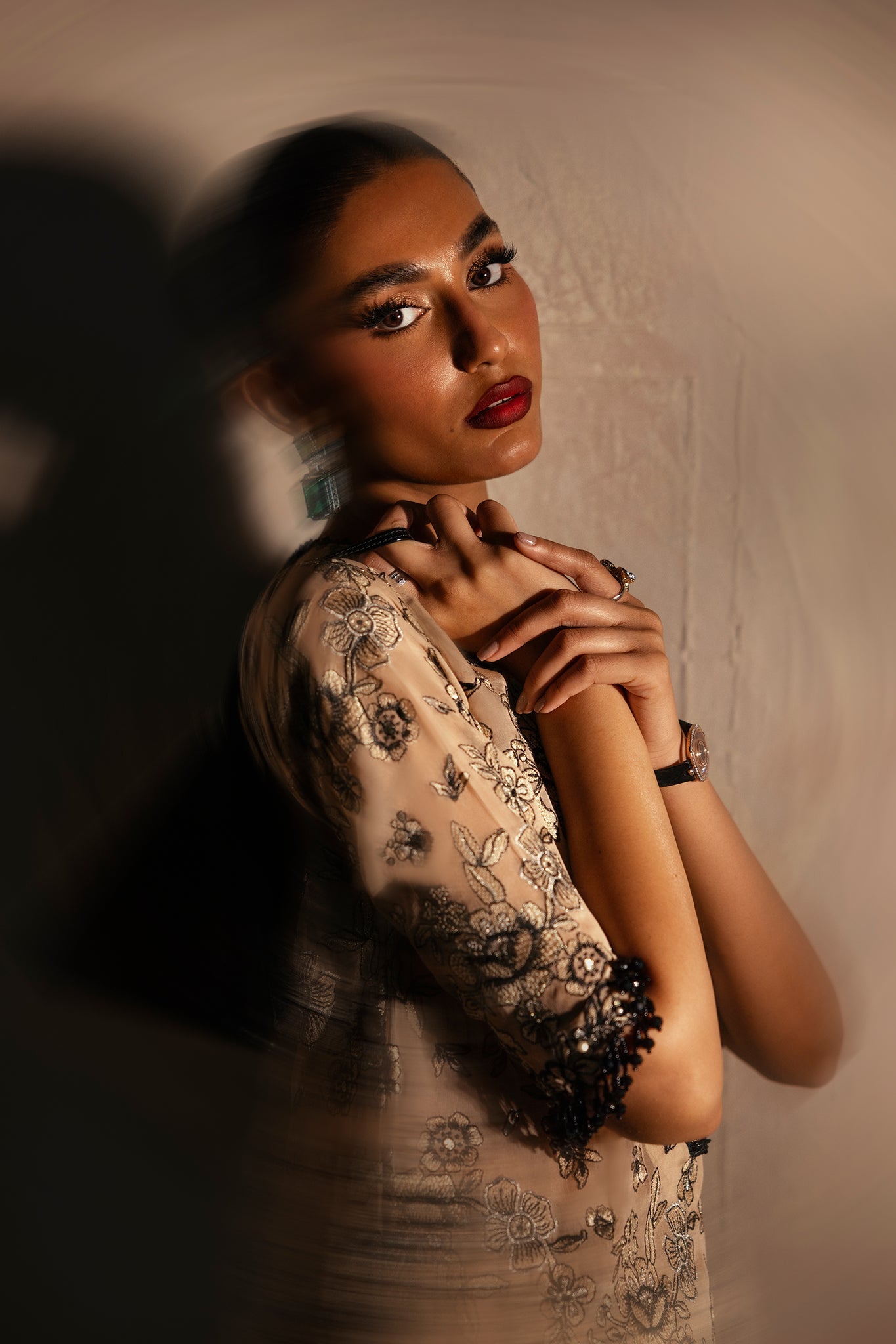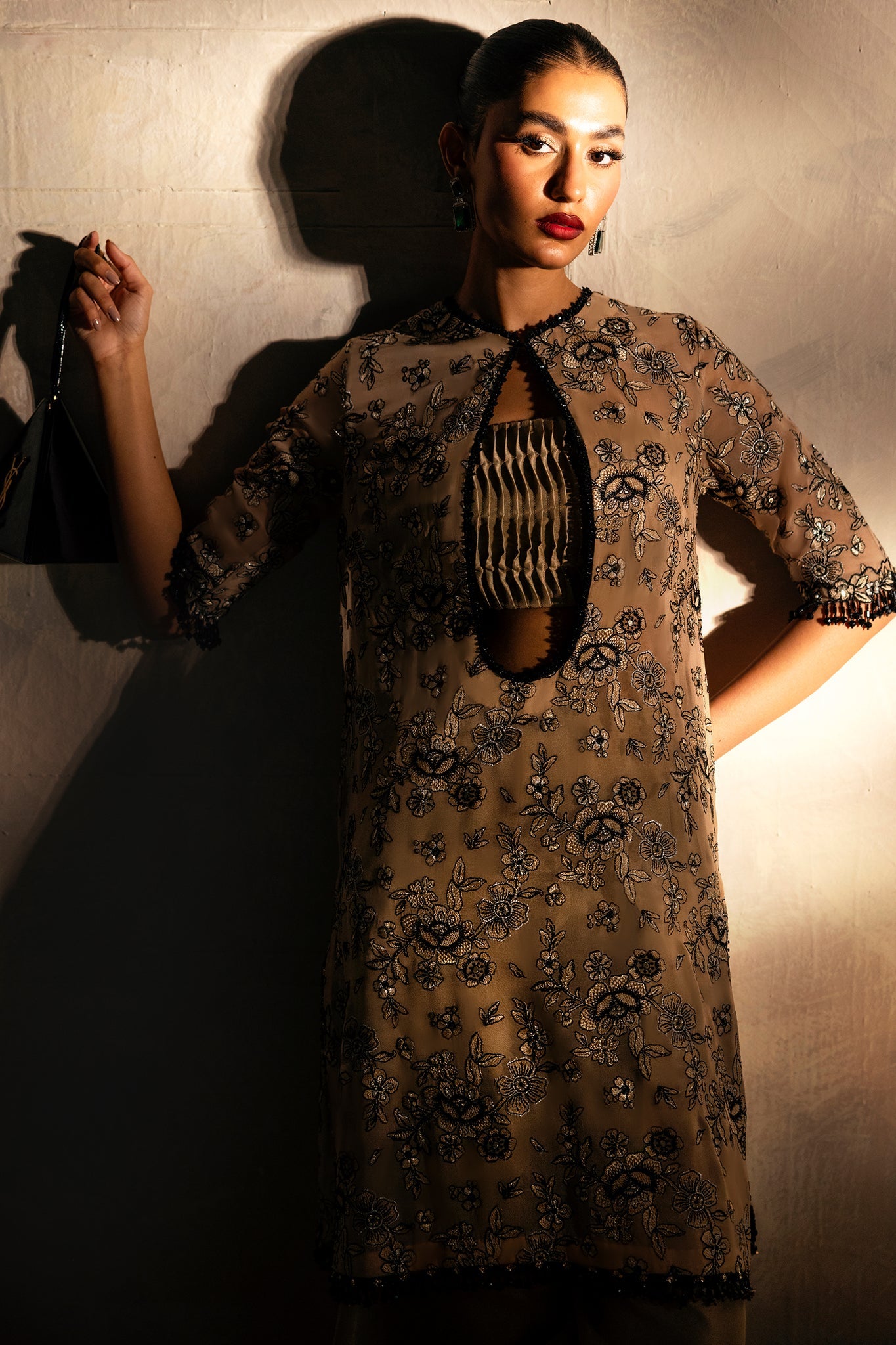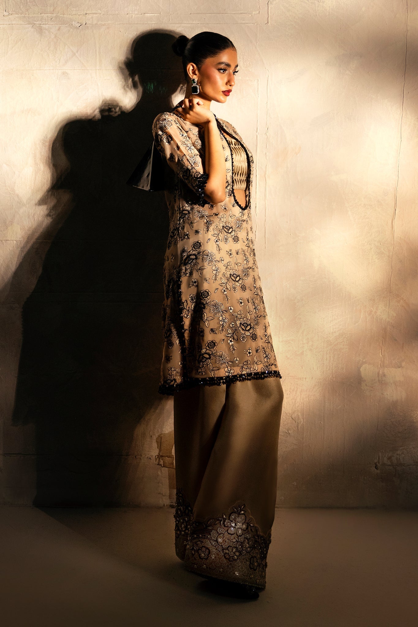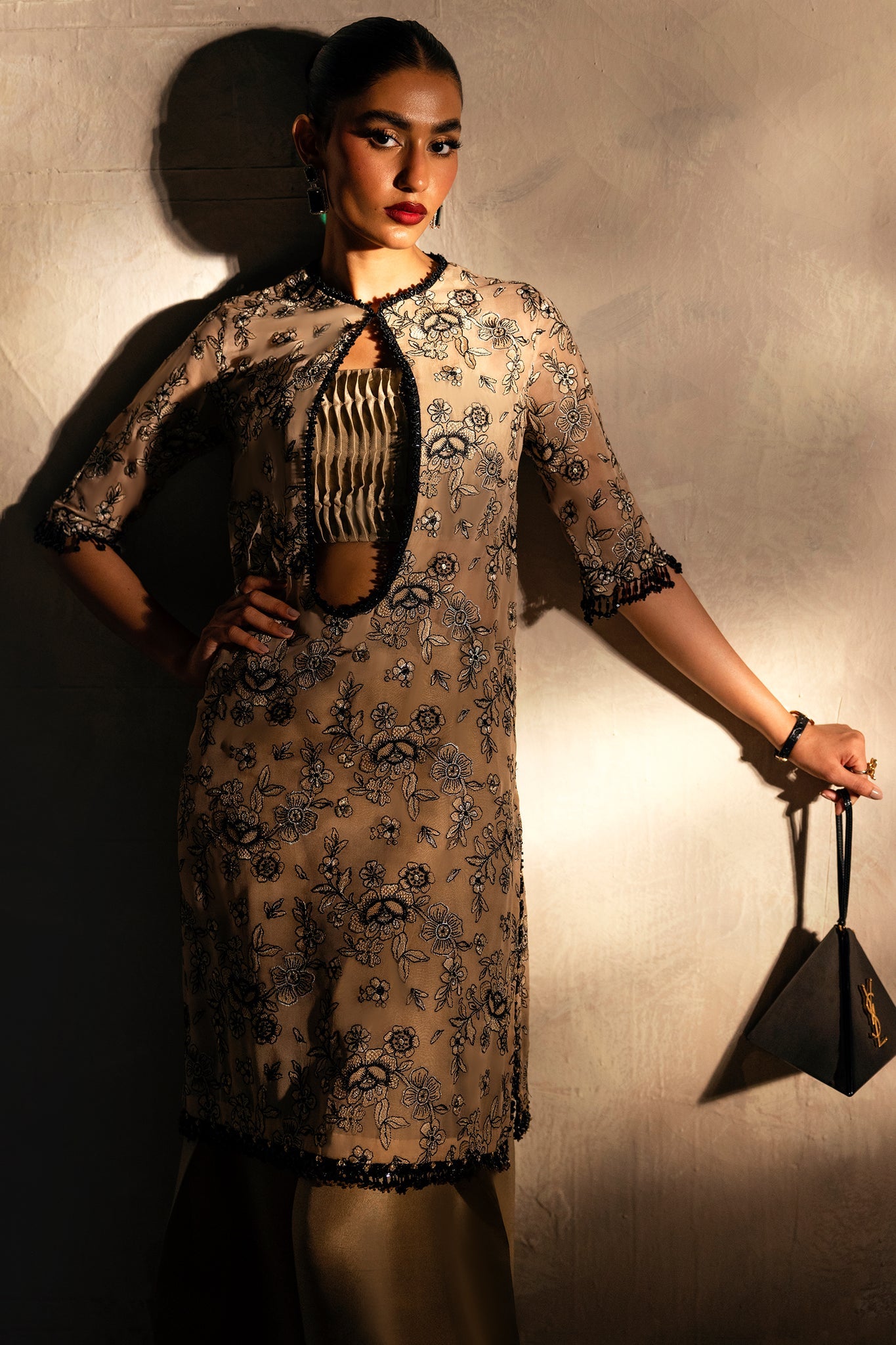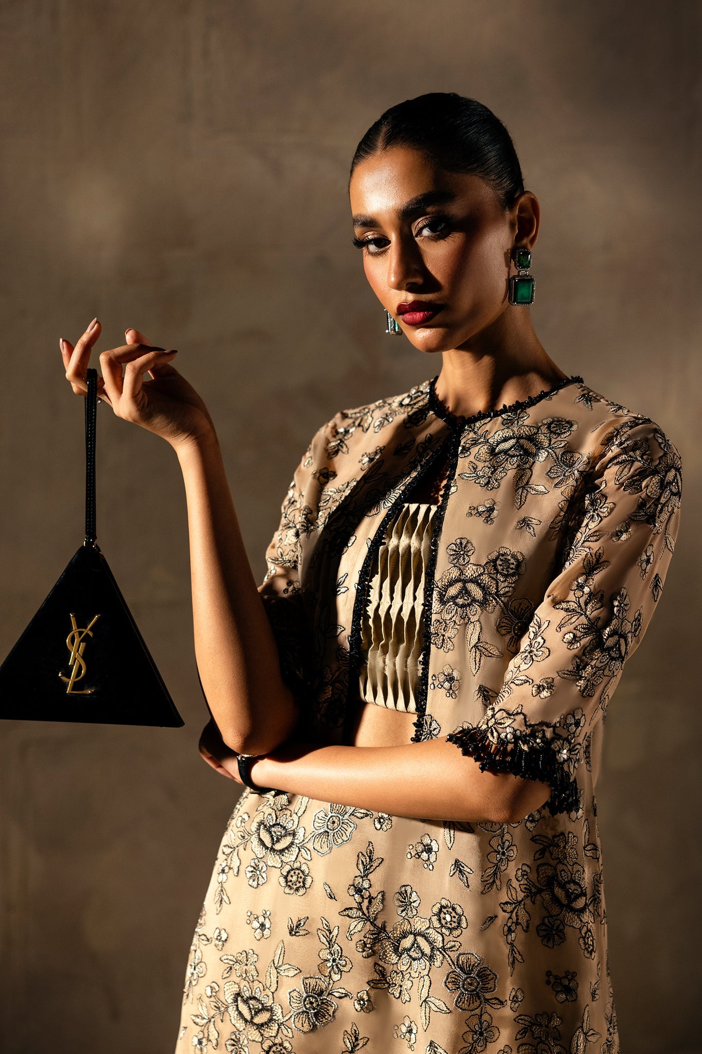 A lustrous gold-hued 'Éclat d'Or' dazzles with unparalleled opulence. Adorned with masterful ebony embroideries, this sublime creation exudes an aura of exquisite elegance. The design, artfully embellished with tilla embroidery, showcases an entrancing floral motif in full bloom. Enhanced by a sumptuous border of radiant pearls and glistening beads, each element is meticulously curated to achieve perfection. This resplendent ensemble epitomizes the zenith of sophistication, making it the ultimate choice for the most distinguished formal occasions.