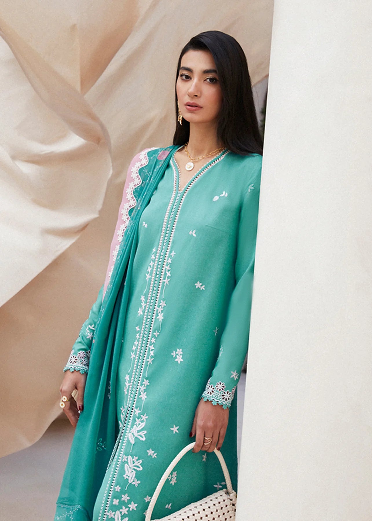 - Caribbean green on summer karrandhi, front open a-line silhouette. V neckline on an embroidered shirt with fitted sleeves and cutwork details. Further stitching details on hem.