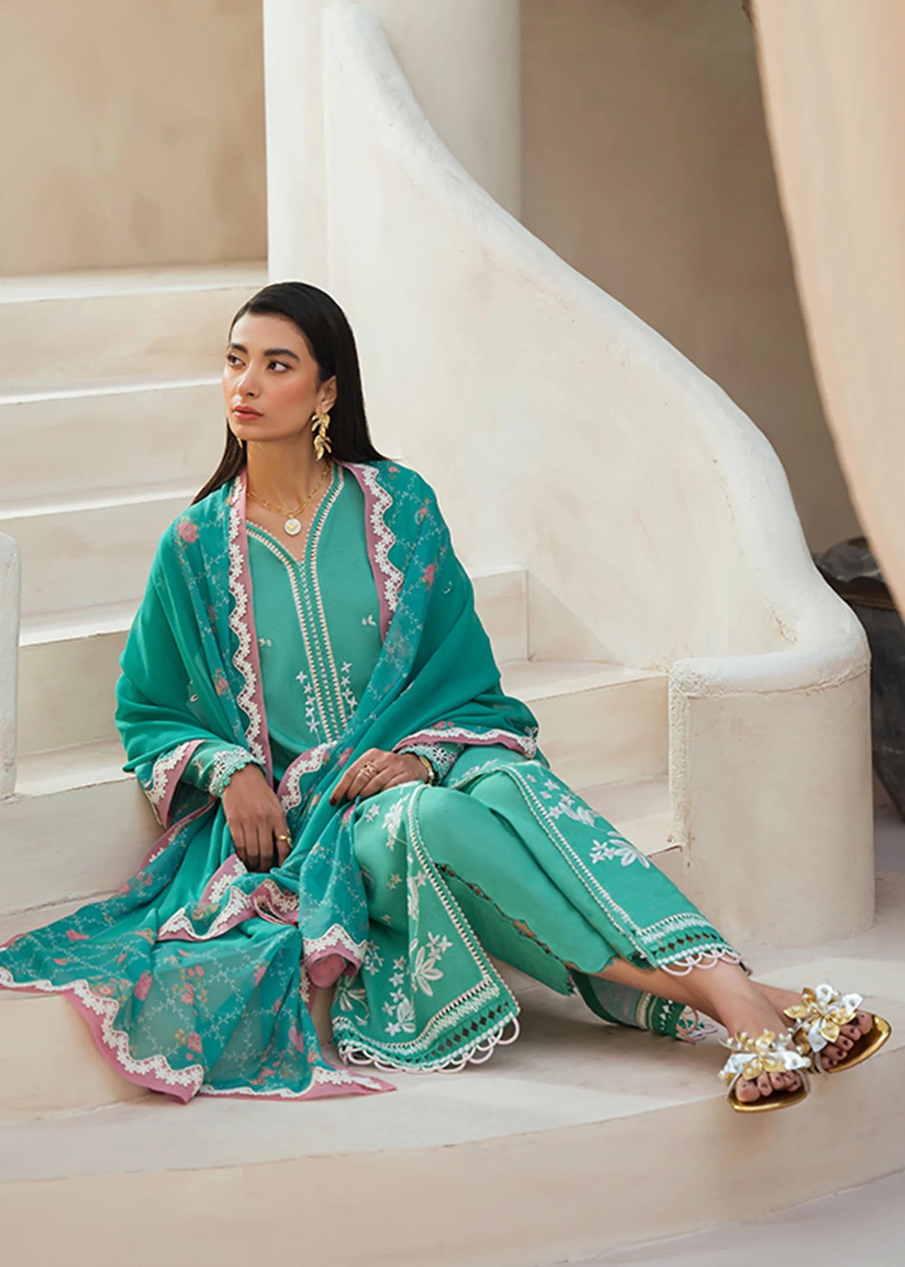 - Chiffon embroidered dupatta with pink scalloped border.