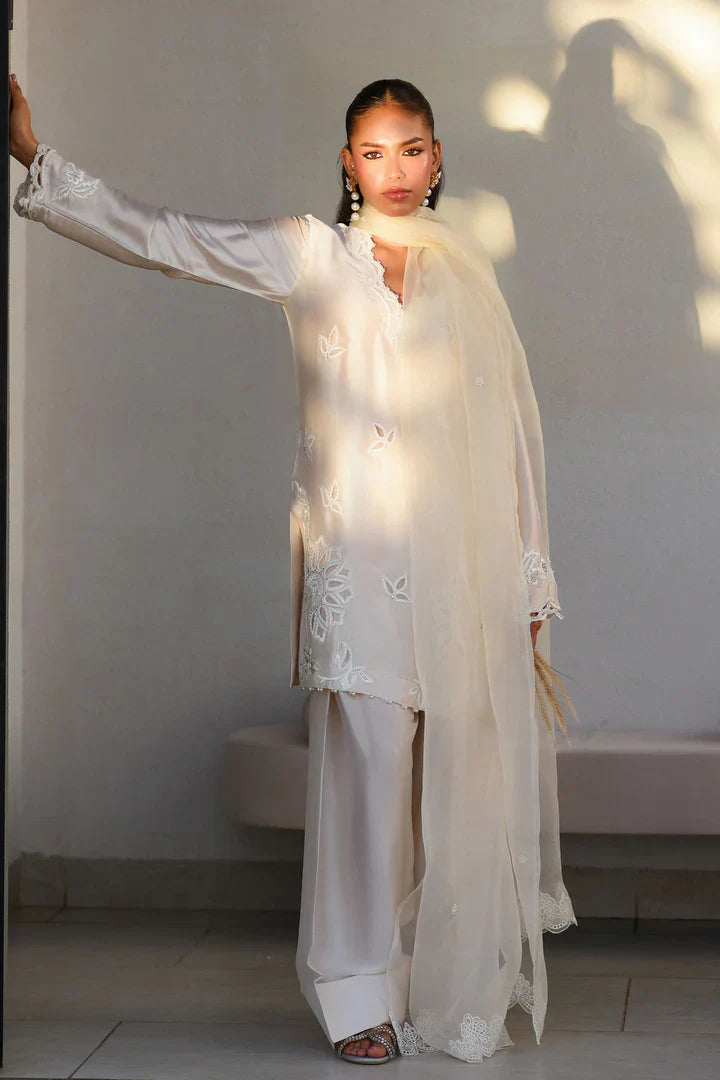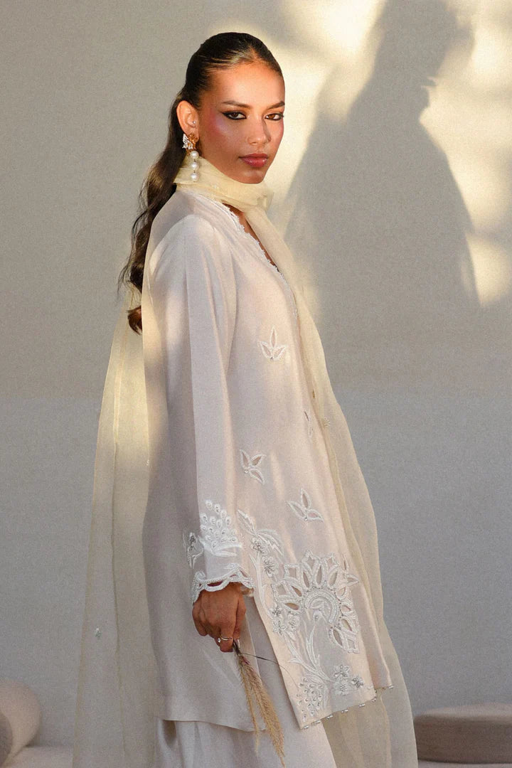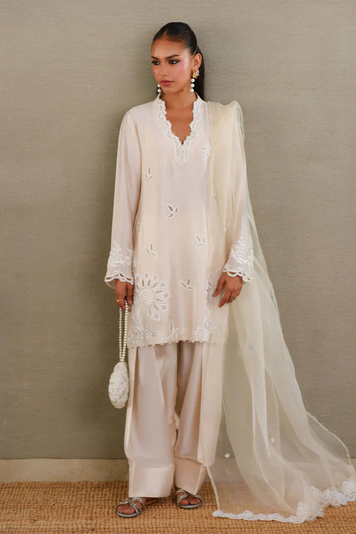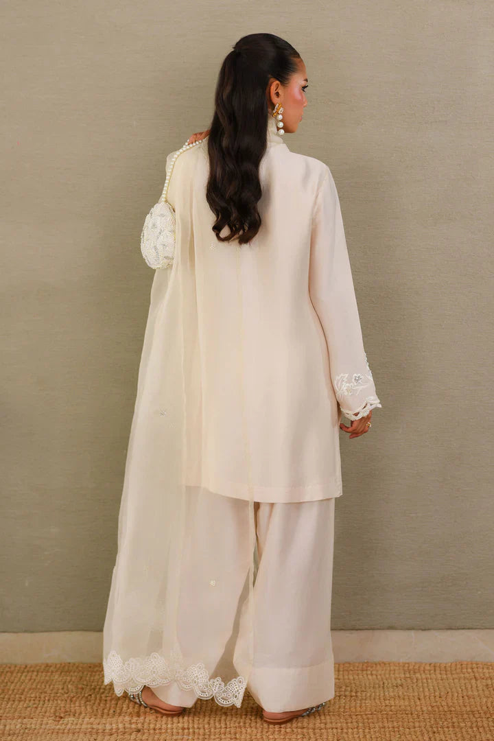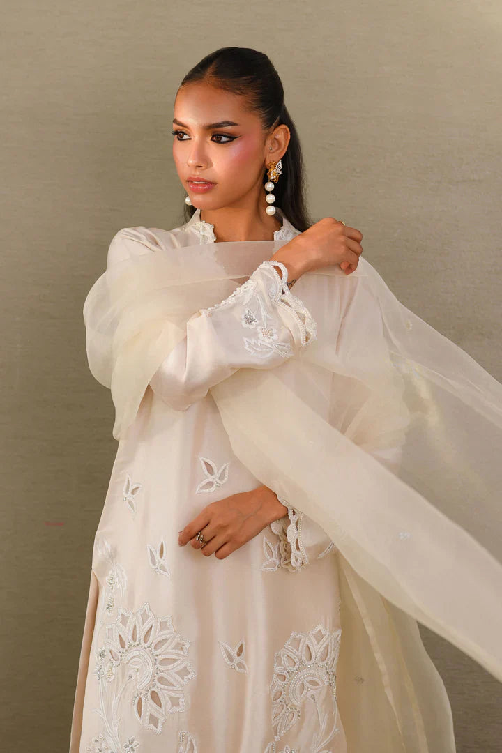 Paired with a matching silk farshi shalwar and a sheer organza dupatta, gently sprayed with pearls and edged with lace-trimmed borders, this look embodies understated luxury-crafted to make your Eid celebration truly unforgettable.