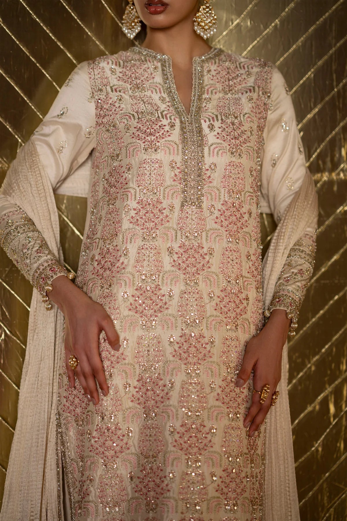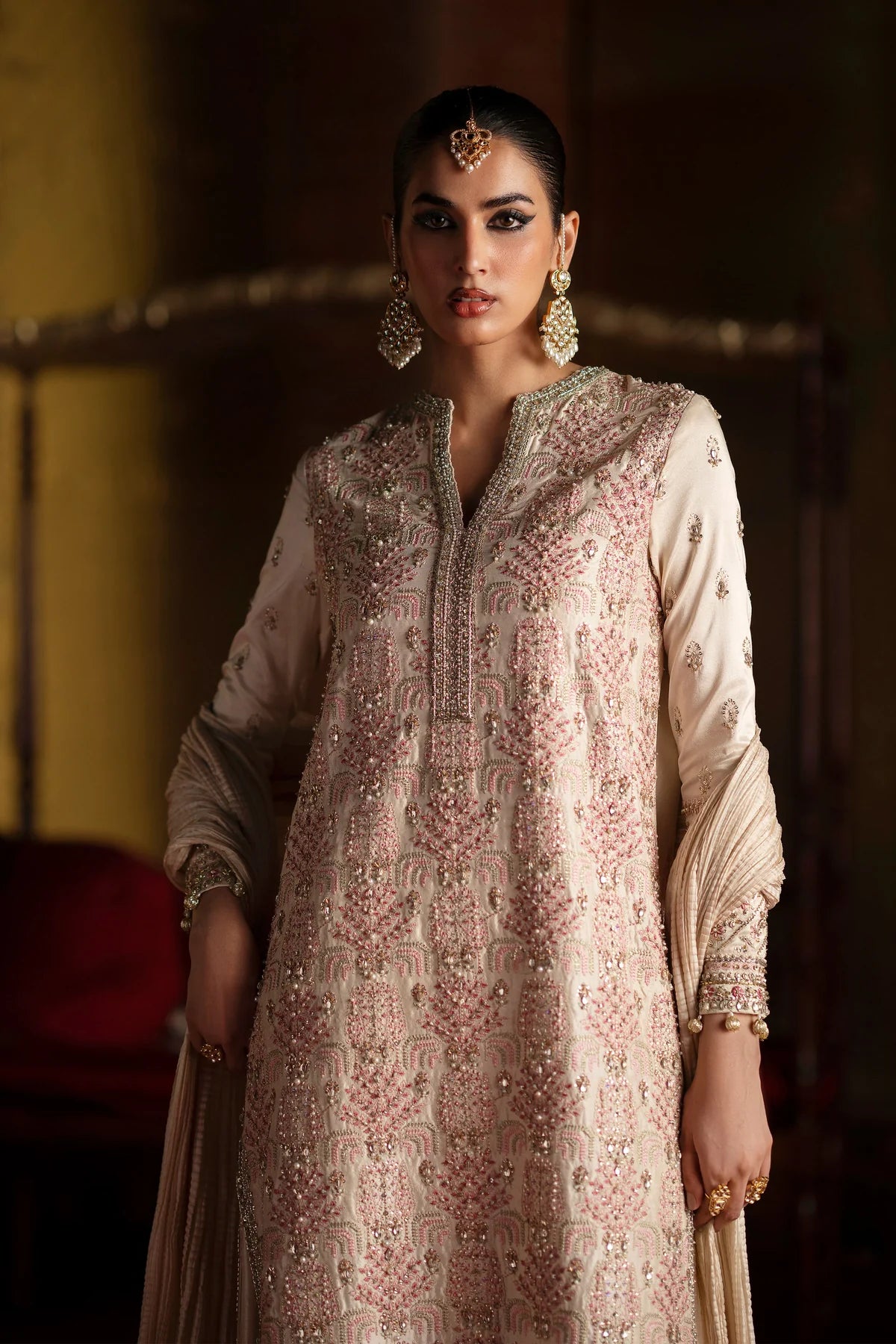 A timeless long shirt in rich raw silk, adorned with delicate pastel-toned embroidery and intricate handwork detailing. Paired with classic azaar pants and a beautifully textured crushed dupatta, this ensemble strikes the perfect balance of elegance and chic sophistication.