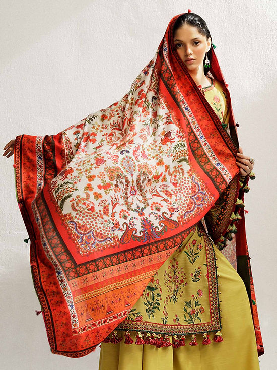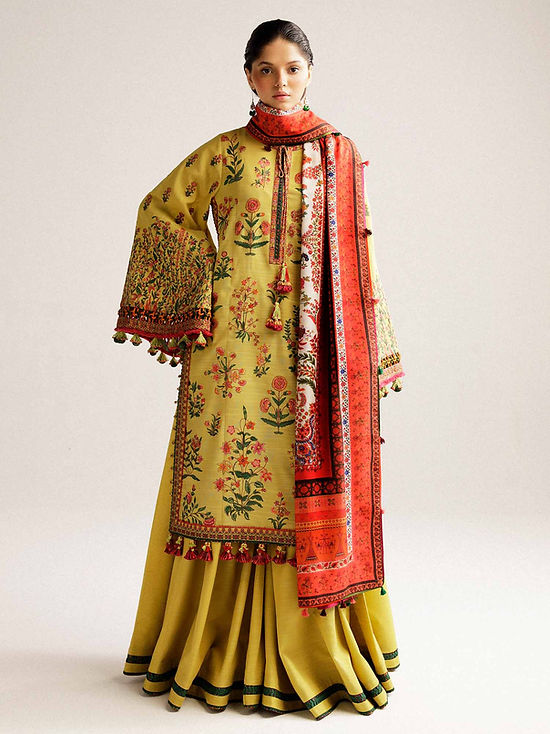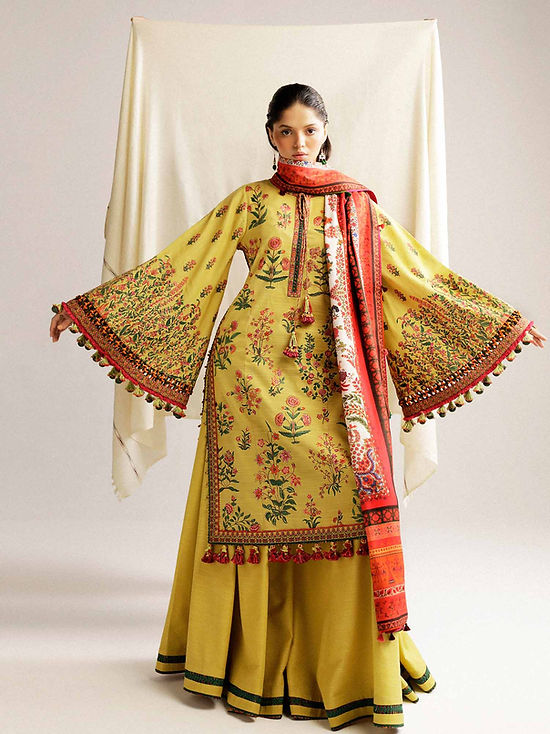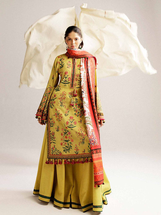 A stunning lime yellow khaddar outfit with intricate floral motifs all over.The sleeves of this outfit are heavily embroidered with intricate and detailed motifs that add a touch of opulence to the overall look. It's a vibrant and cozy ensemble that exudes elegance. The embroidery adds a touch of delicacy while the ptinted shawl adds a layer of texture and visual interest.
