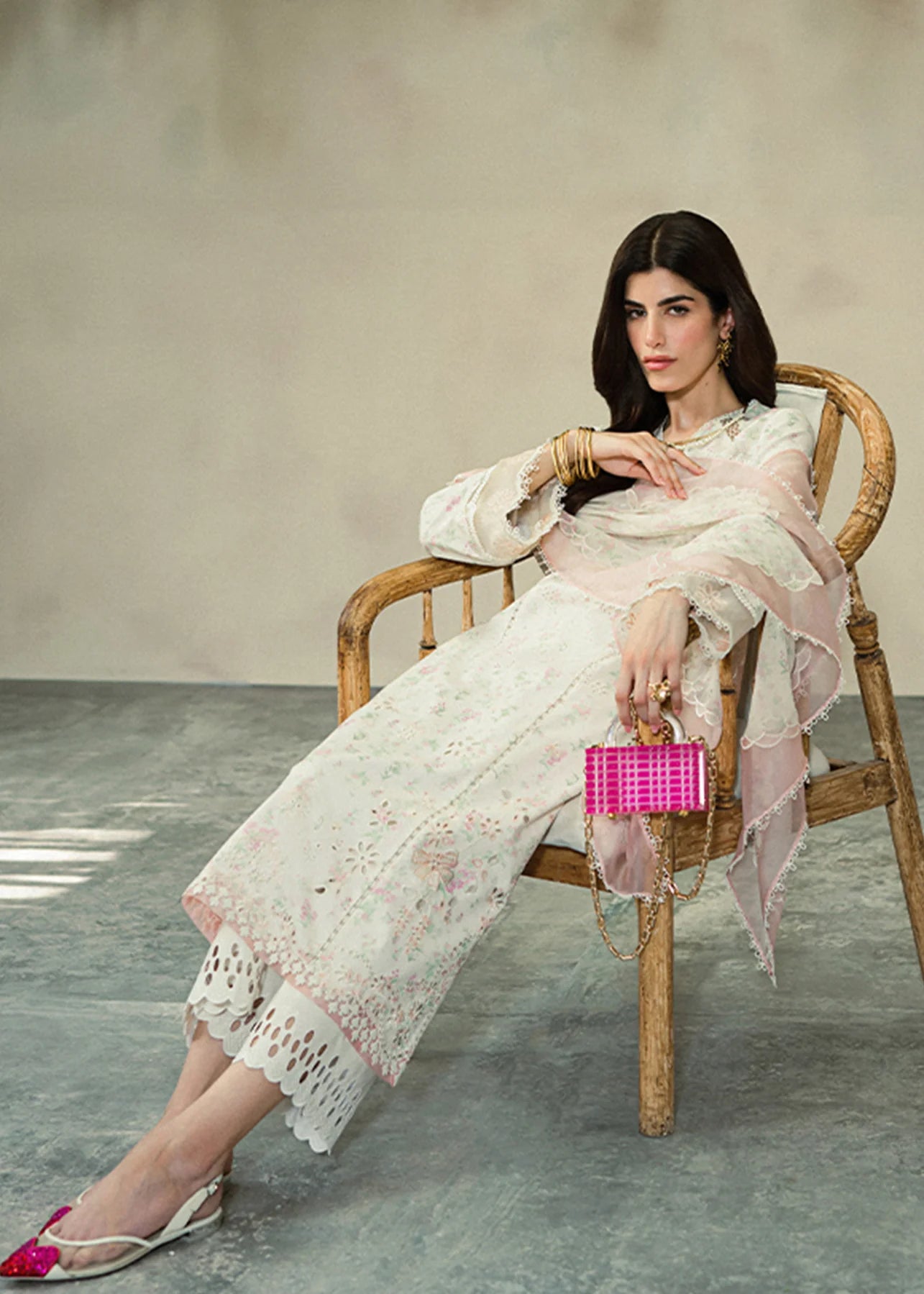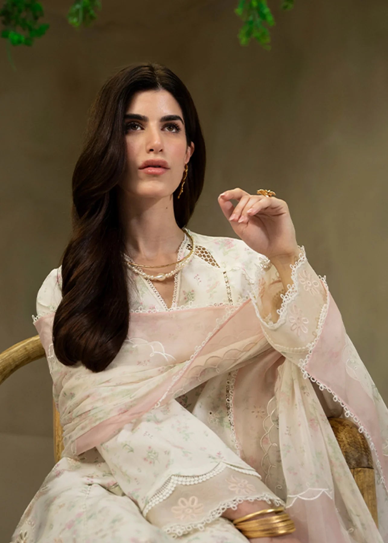- Ivory white printed lawn a-line shirt, V-neckline with keyholes and ragline additions cutwork detail and Printed base with layered scalloped sleeves with peachy pink organza border.