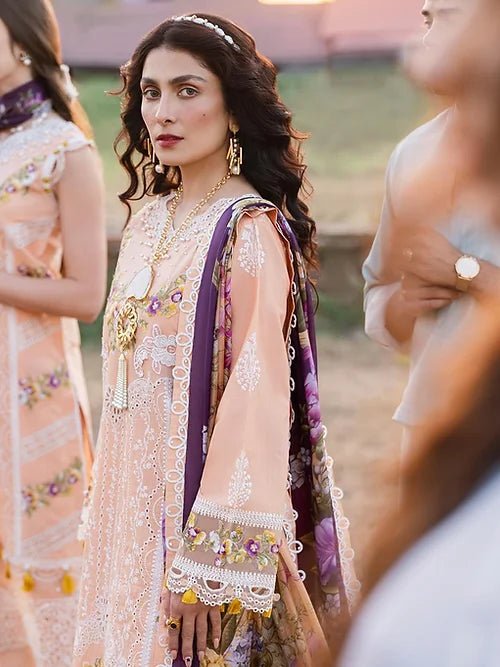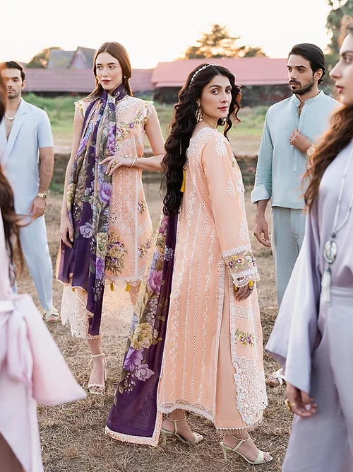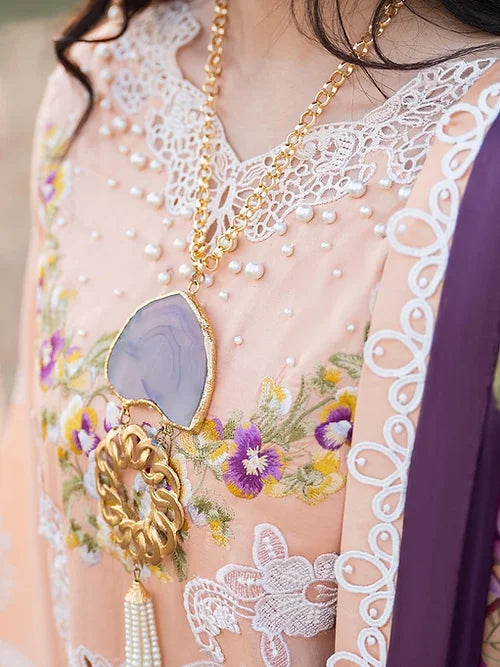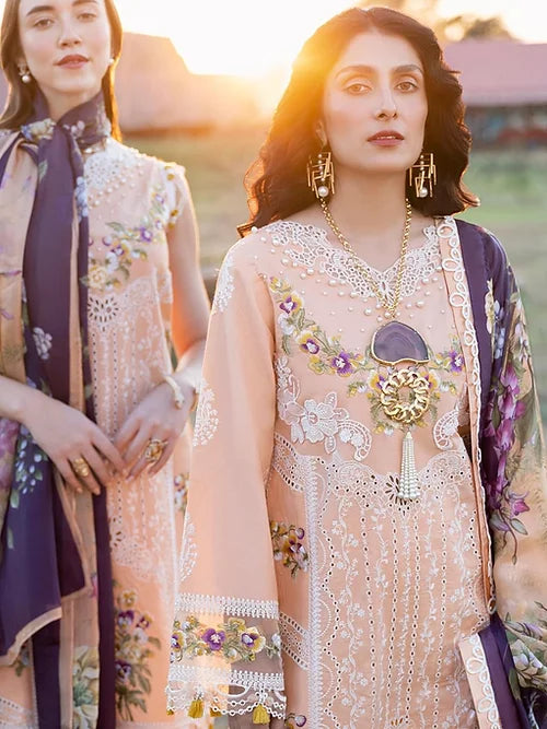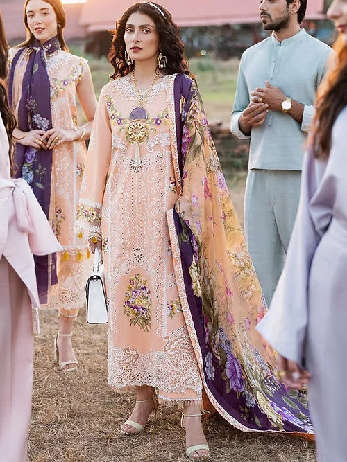 FAH means “sky” in Thai, and the name plays the perfect metaphor to the silhouette of this beautiful number. Curated on a very subtle and light shade, this attire brings the best out of the wearer. The embroidered neckline motifs, and all the panels of the upper create a simple yet graceful look. The ensemble is completed with a dark purple pure silk dupatta printed with a floral theme. A design like Fah can be the highlight of your summer wardrobe.