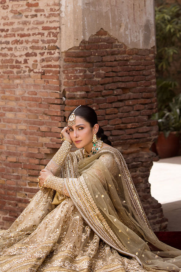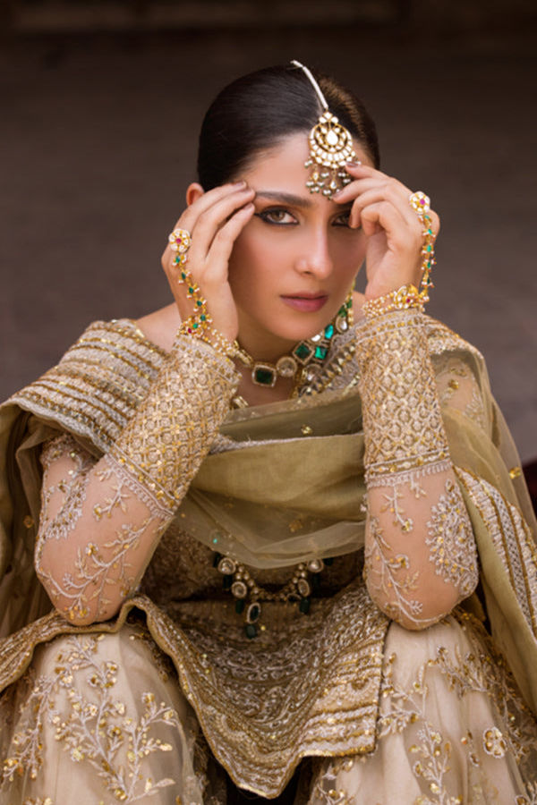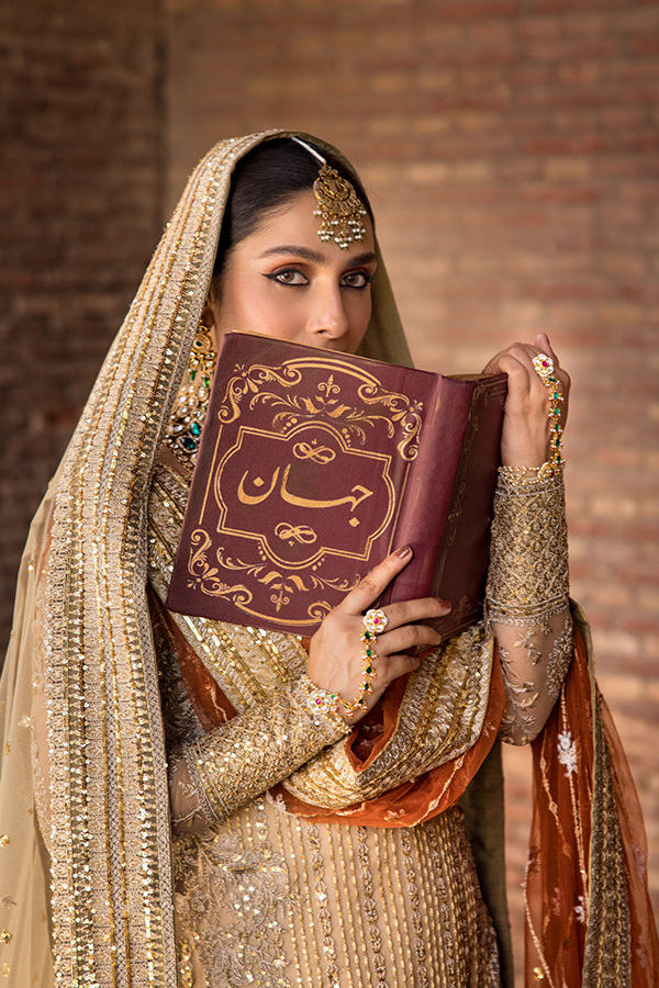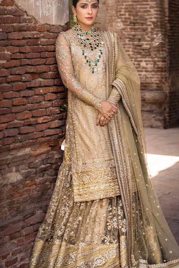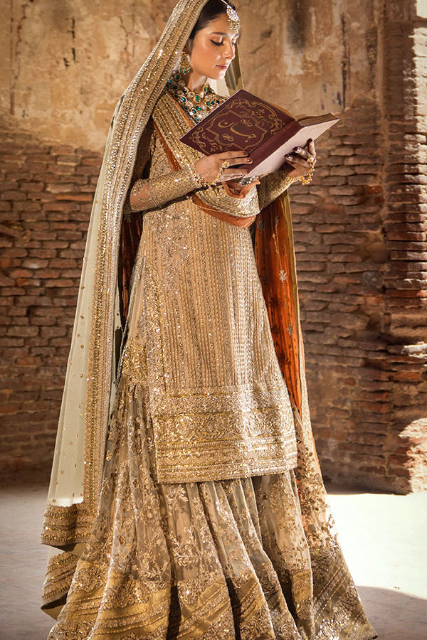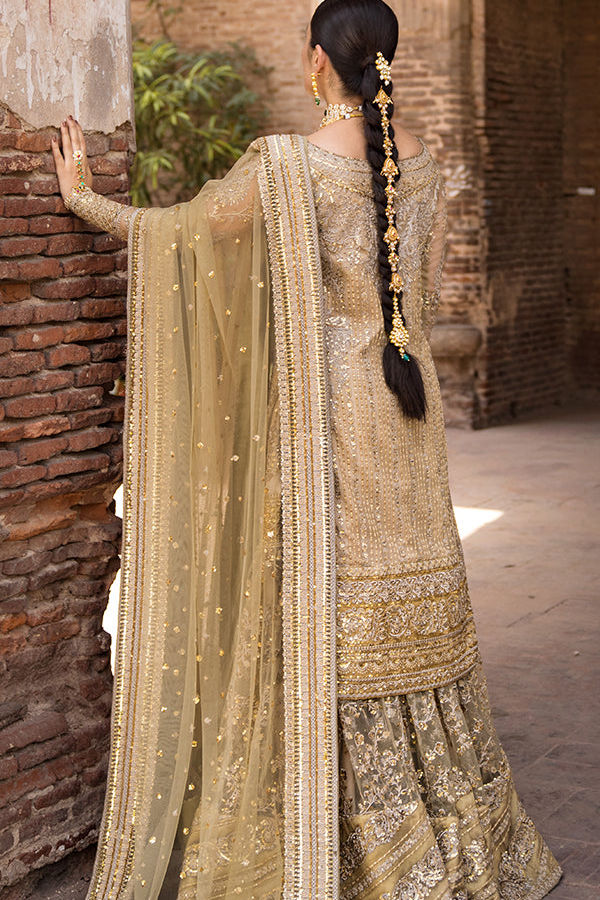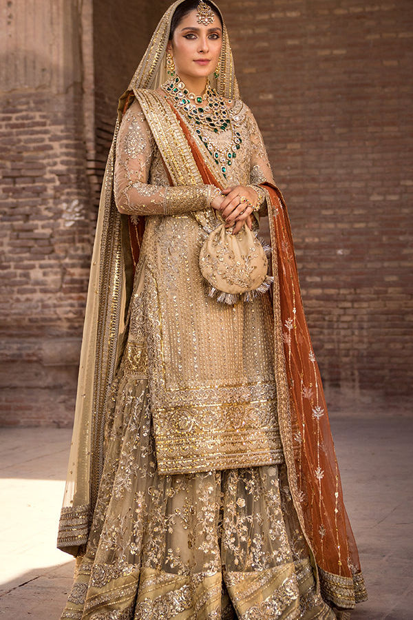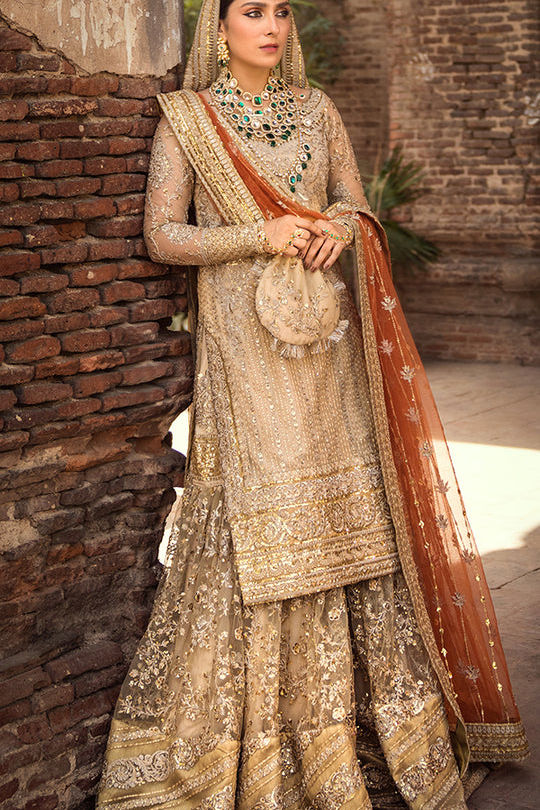 An opulently embellished ensemble that exudes sophistication. The net champagne-colored mid-length shirt is adorned with luxurious embroidery, creating an aura of elegance. Delicate tissue fabric borders enhance the shirt, adding refined charm. Paired with a net gharara, intricately decorated with three distinct embroidery patterns, the outfit showcases impeccable craftsmanship and timeless allure. Draped gracefully, the matching champagne-colored net dupatta lends an air of regal sophistication. For a captivating contrast, a rust-colored net dupatta with four-sided borders introduces a hint of drama and intrigue, elevating the ensemble to unparalleled heights of elegance and charm.