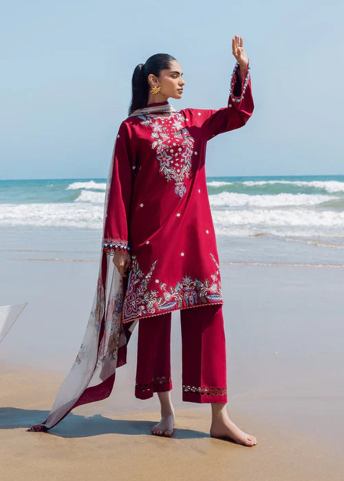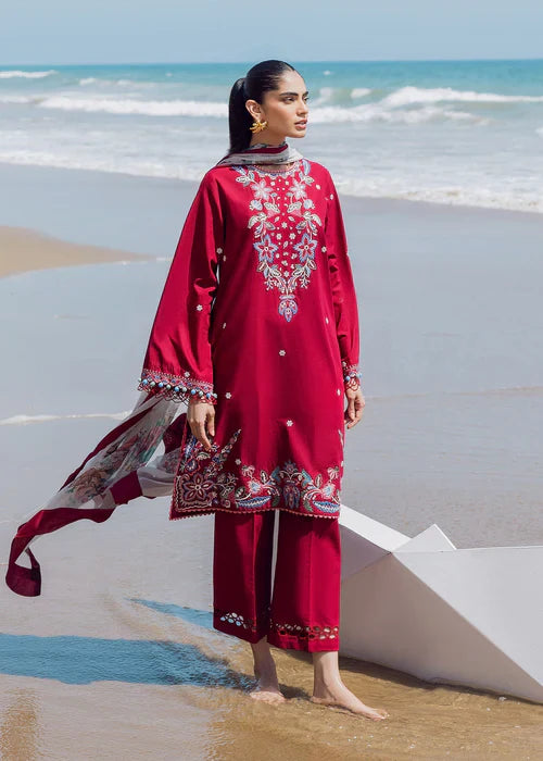 Embroidered lawn shirt - 2.5 yard Embroidered organza front hem border - 1 pc Embroidered organza sleeve border - 45"" Embroidered lawn neckline patch - 1 pc Dyed woven cambric trouser - 2.7 yard Digital Printed chiffon dupatta - 2.7 yard"