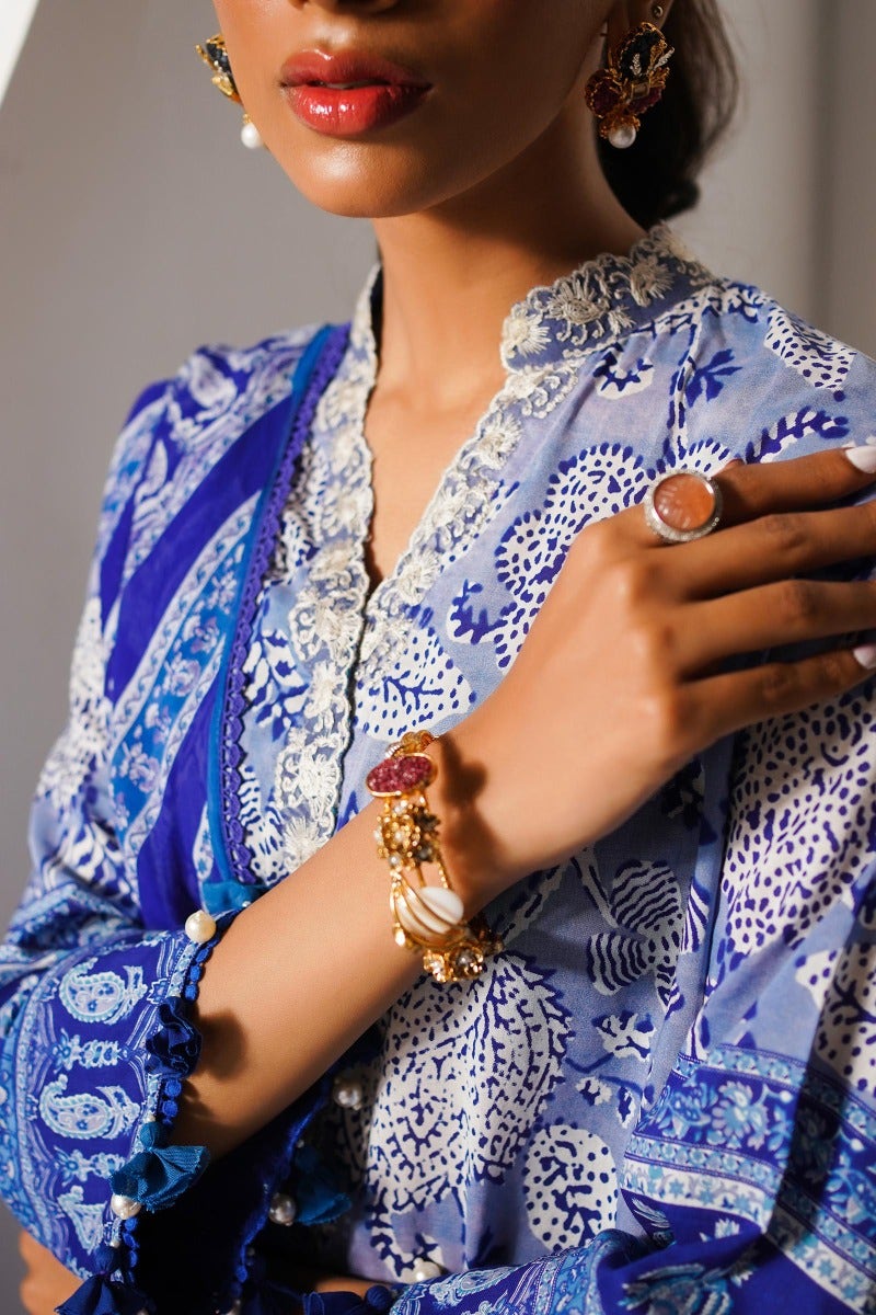 A harmony of floral blooms, drawn from the lush beauty of nature, comes to life on an airy lawn canvas. Adding to  the allure is a graceful chiffon dupatta adorned with delicate patterns to create a botanical dreamscape.