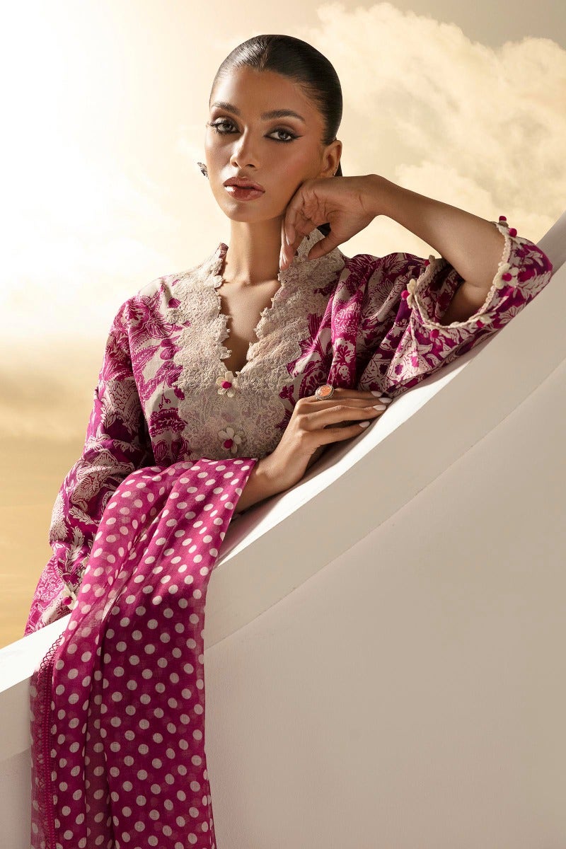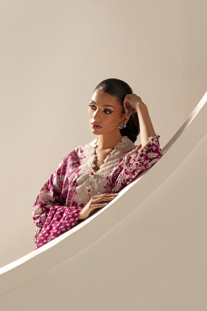 Emotions inspired by nature are meticulously crafted on a diaphanous canvas, resulting in a melodic creation. Fusing in perfect harmony with the ensemble is a polka dot digital printed dupatta in cross slub, completing the look with finesse.