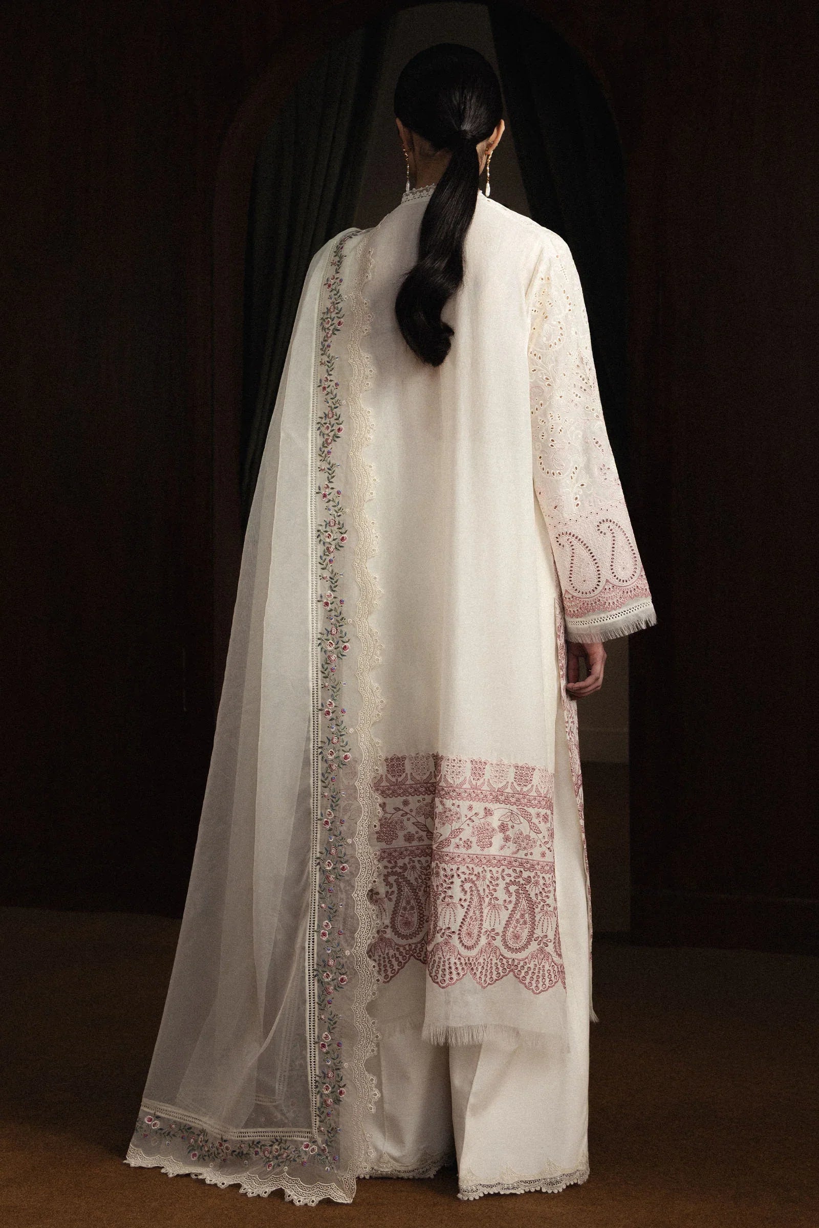 Hoshimi is bathed in off-white with bold chikankari and lace-inspired embroidery, paired with a coordinating embroidered dupatta and dyed cambric trousers featuring delicate lace borders. Accented with organza panels and detailed embroidery, the ensemble exudes heritage-rooted grace and understated sophistication.
