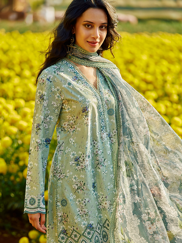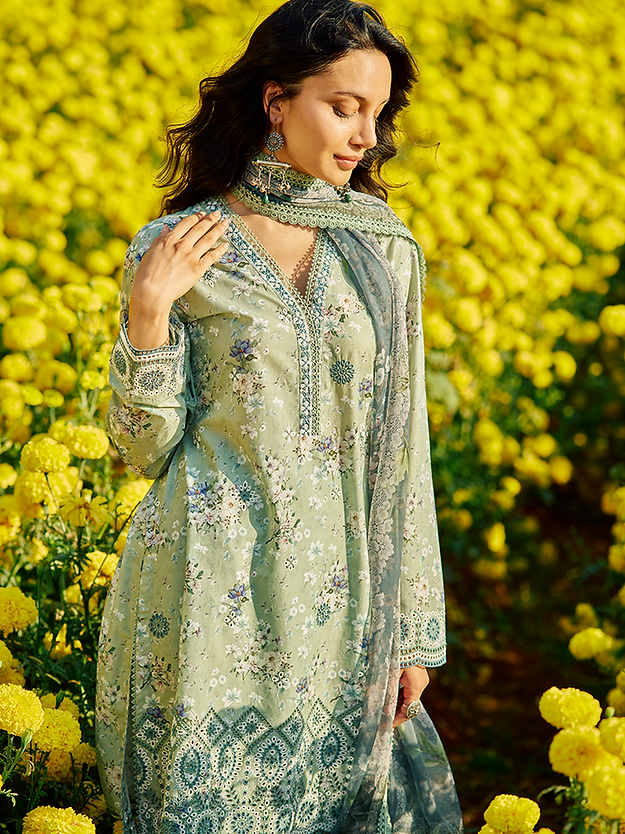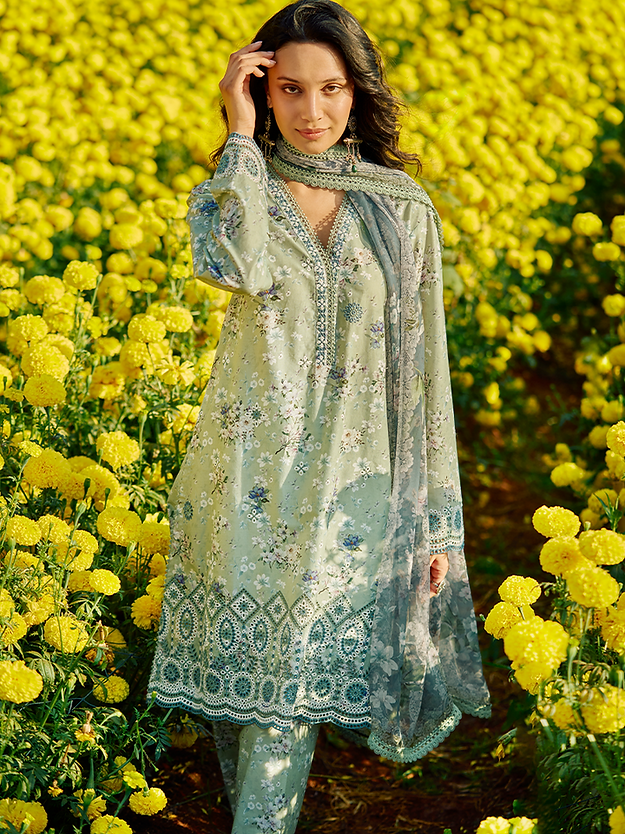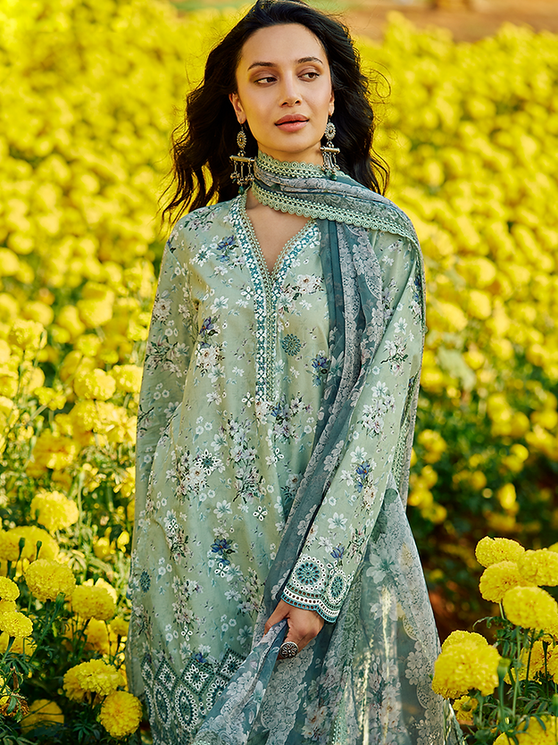 Inzah has a light sage base that sets the tone for a refreshingly calm look that is filled with beautiful flower bouquets on the shirt. The schiffli embroidery on the sleeves and bottom consists of intricate geometric patterns that add more charm to the outfit. The combination of light sage and teal on the dupatta, with elegantly embroidered lace on its border completes the look.