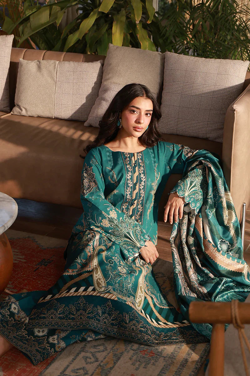 Refresh your summer style with this elegant teal lawn ensemble, crafted to balance comfort with refined detailing. The printed lawn shirt is beautifully enhanced with an embroidered organza neckline border, a delicately embroidered organza front border, and graceful embroidered motifs on the sleeves, finished with embroidered organza sleeve borders for a polished look. Paired with a flowing printed silk dupatta and printed cotton trousers, this ensemble offers effortless sophistication for everyday wear.