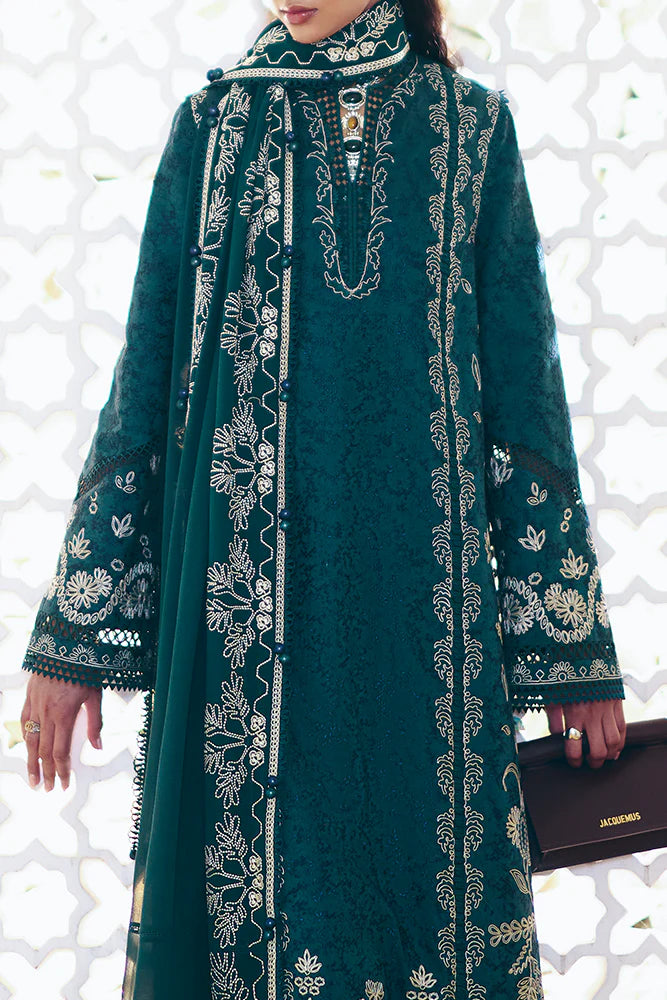 - The dupatta is made of chiffon in a complementary tone. It has four sided contrasting embroidery and is finished with lace and tassel details.