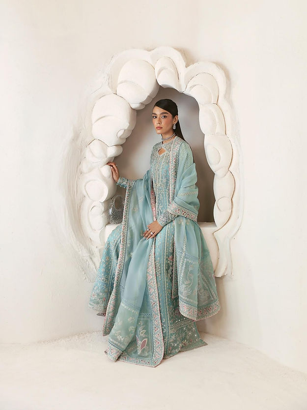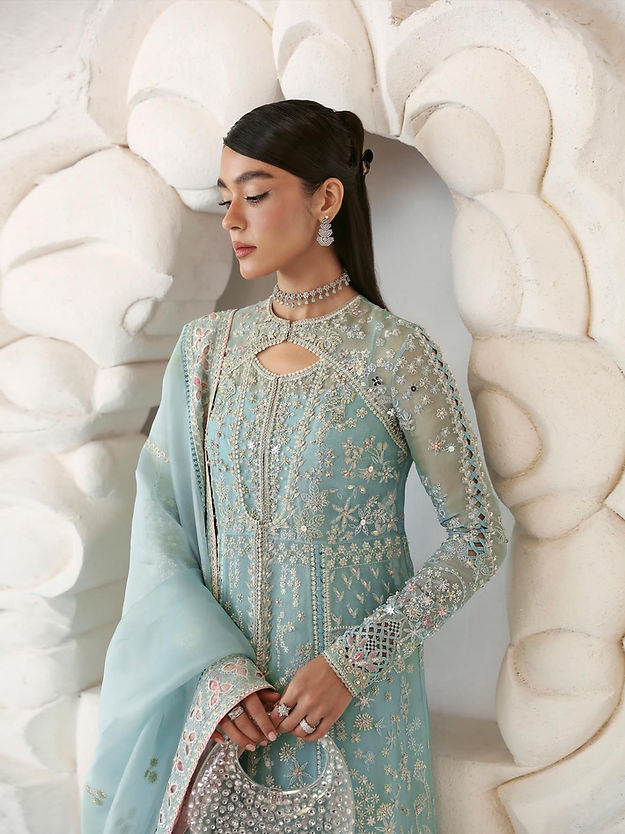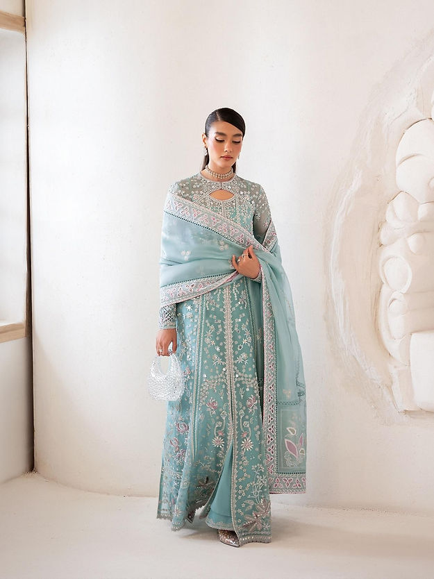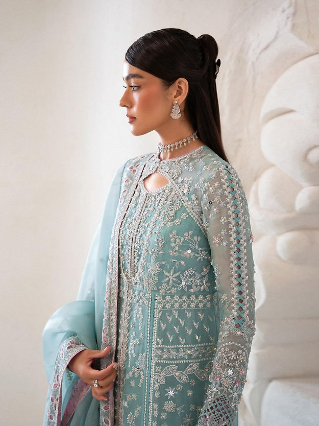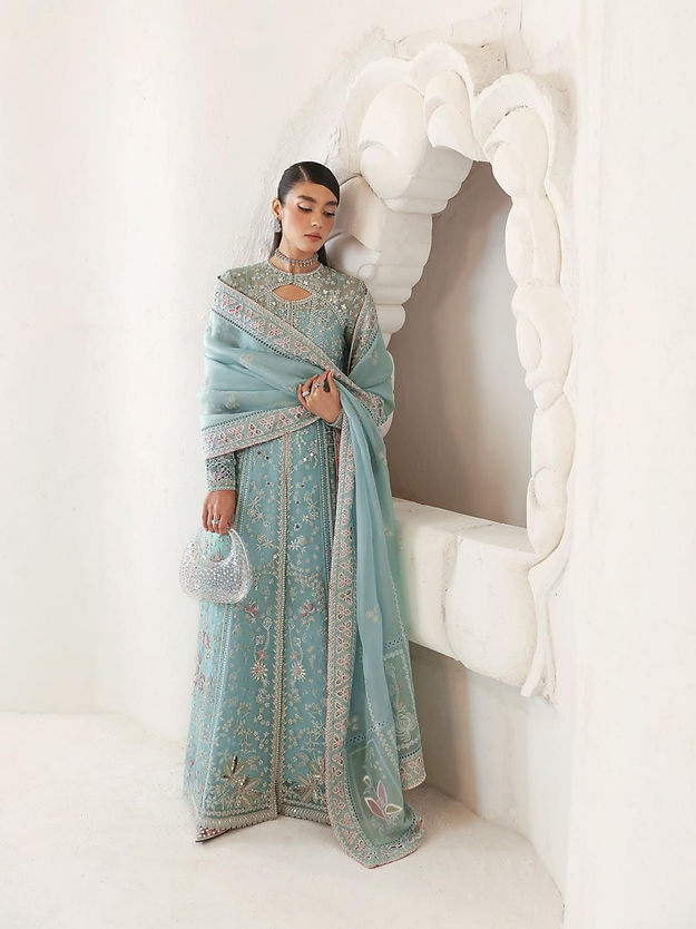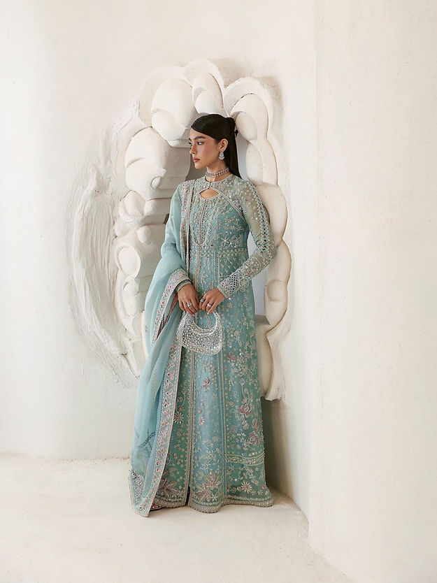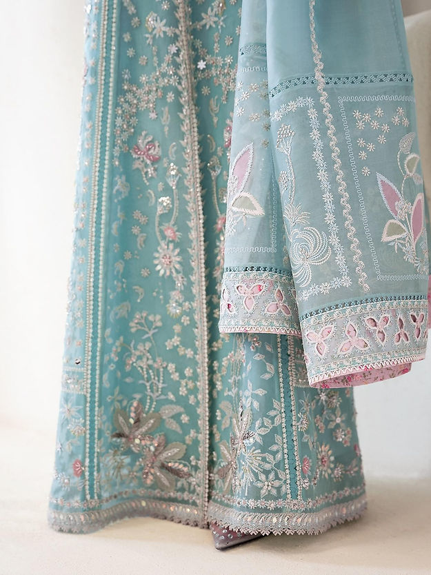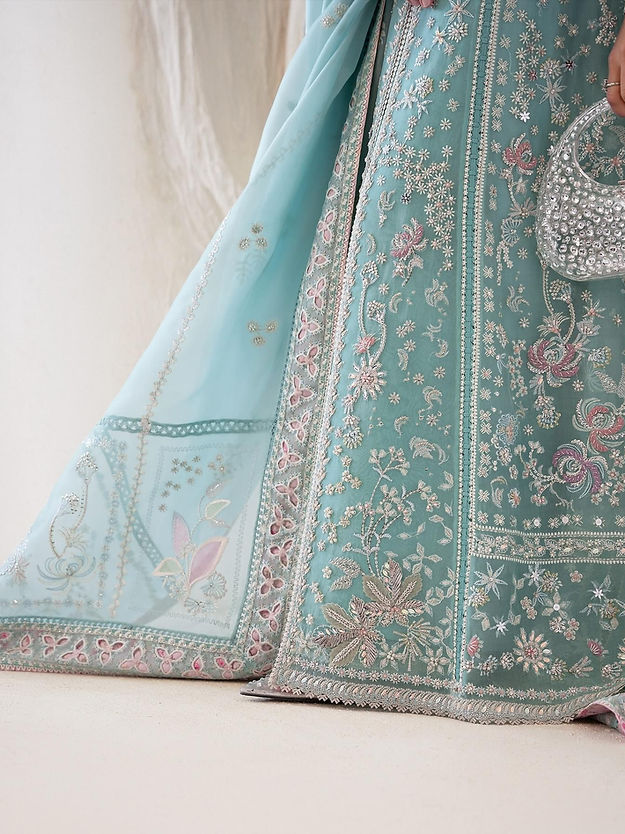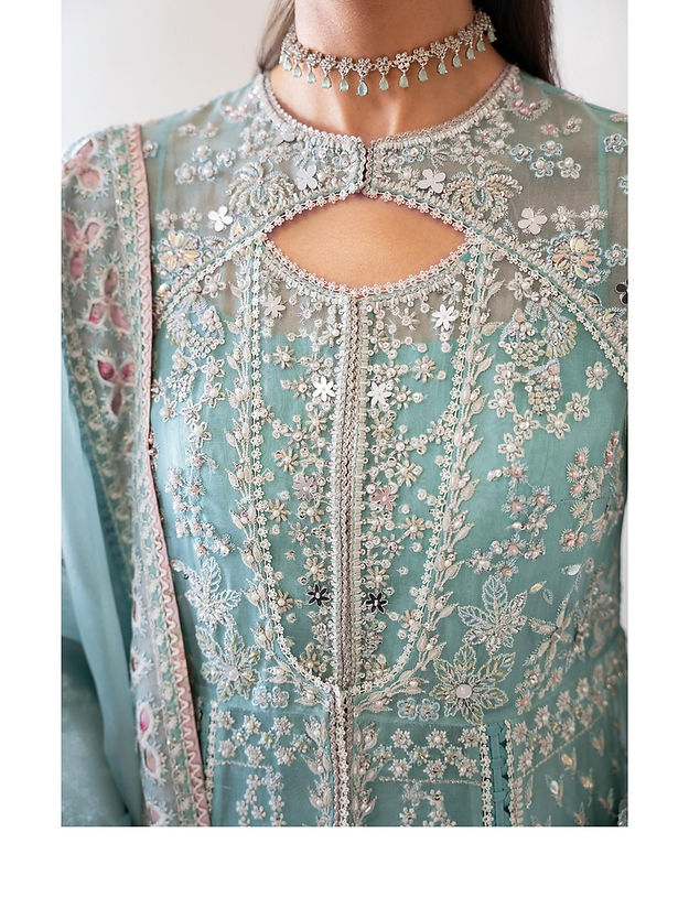 - Ice blue front open pishwas, with embellishments and embroidery with stone work and rubies and keyhole neckline and raglan fitted sleeves. Stitching details in between the panels and on the sleeves which also have further patchwork.