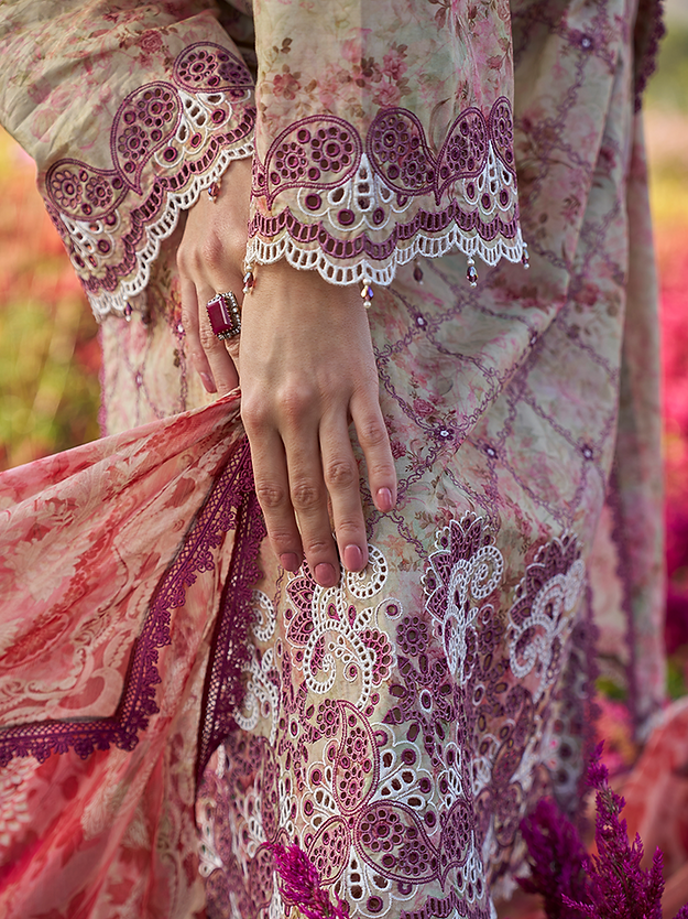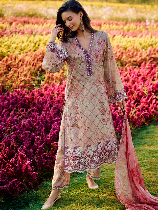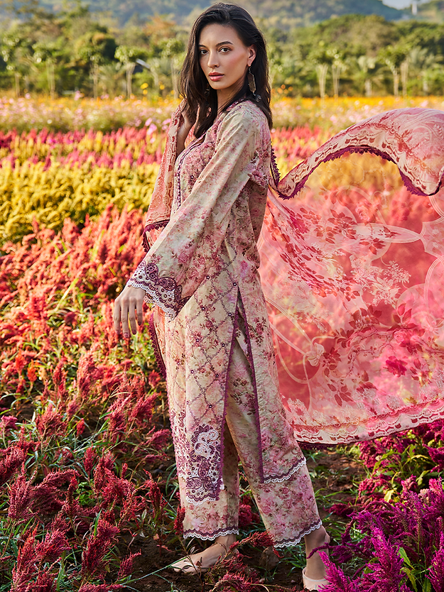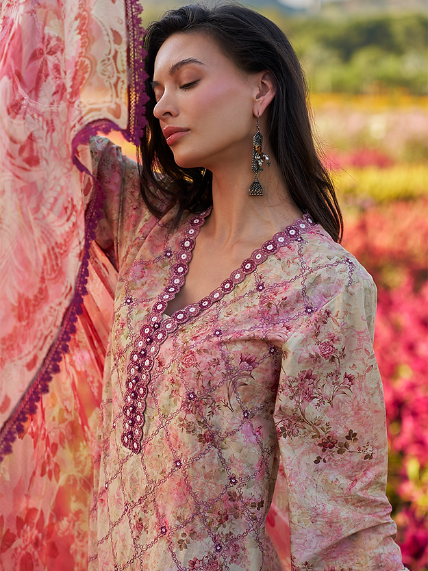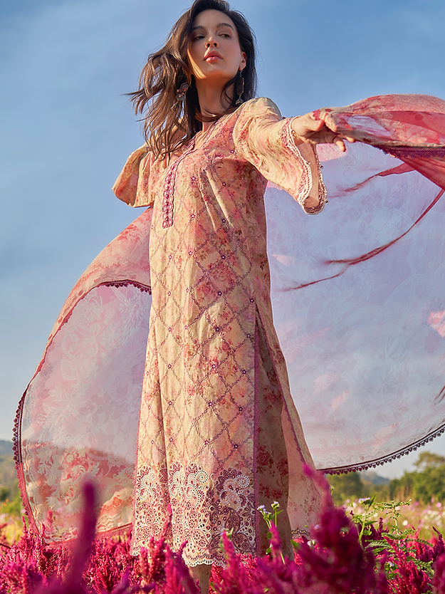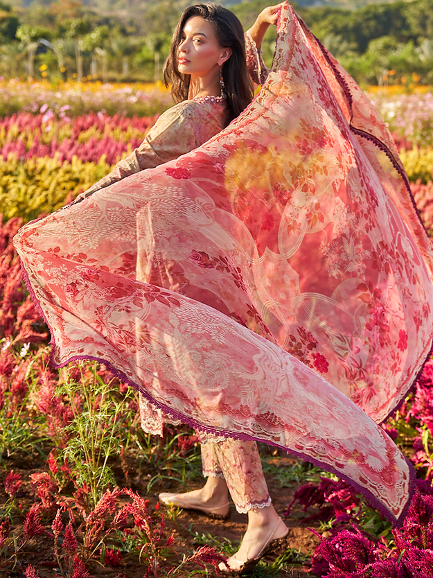 The Mughal styled jaal pattern all over the shirt is complimented by different hues of pink coloured carnations across the shirt. Its purple and white schiffli embroidery in geometric patterns gives this outfit a royal touch. The chiffon dupatta compliments the outfit with beautiful floral patterns in different shades of pink, red and orange.