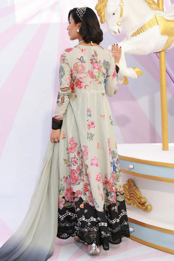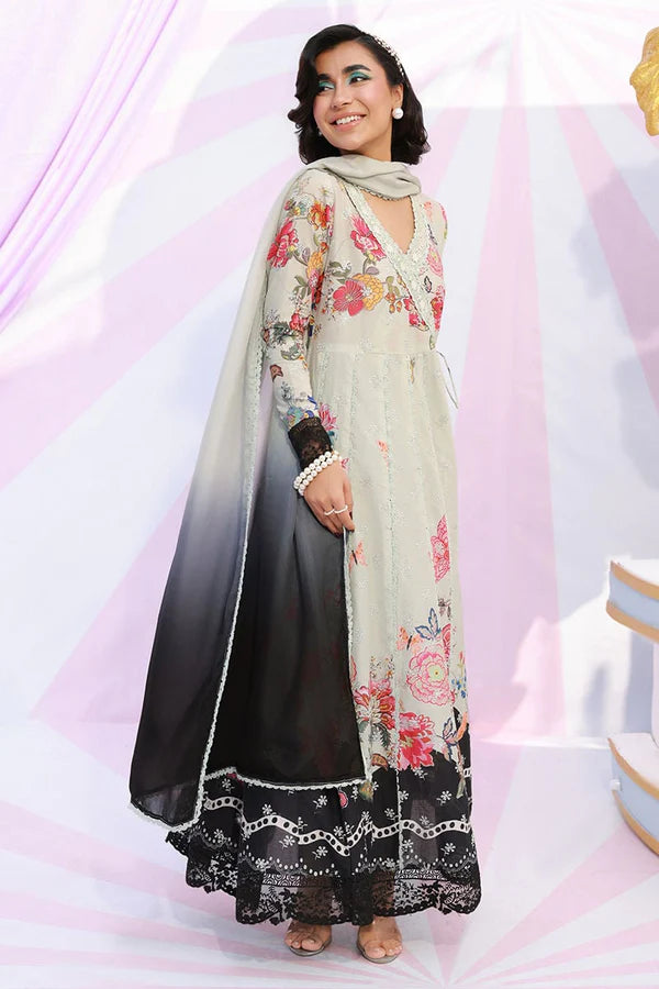A Light grey printed schiffli angarkha in a body-cut silhouette, adorned with intricate embroidery throughout. Features a color-block printed border with embroidered lace detailing, complemented by black embellished butterfly tassels. Paired with straight grey cotton pants and a medium silk ombré dupatta with lace accents, creating a refined and modern ensemble
