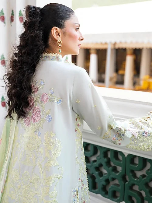 KAMON, this majestic and artfully composed attire features an extravagant array of delectable embroidery and celestial tone. An ensemble created on a very subtle and smooth hue, Kamon is a design that enhances grandeur and regality of the wearer. The chikan embroidery on the front and back create a perfect combination with embroidered front daman. Embellishments of tassels on the hem and sleeves curate this design to the majestic vibe it is made for.
