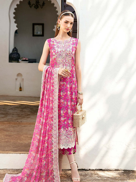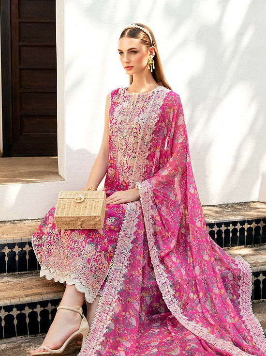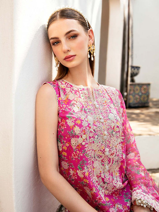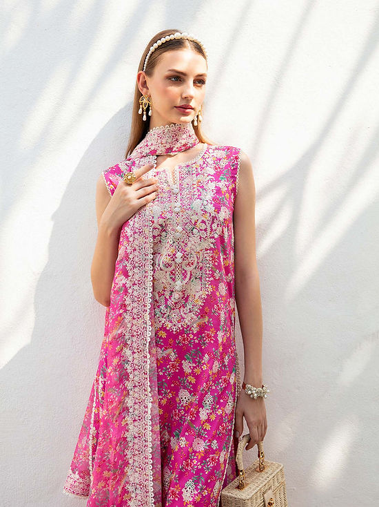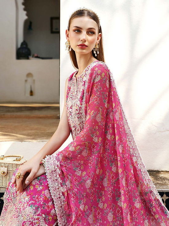 A bright, pink canvas is layered with delicate flora printed in mesmerising shades of sage, Laguna, yellow and ivory . Featuring an artsy blend of intricate bottis and pretty floral prints this design epitomises a classic understated sophistication. The cheery shirt is offset by a tonal printed chiffon dupatta framed with an embroidered, ivory festoon completing the look to perfection.