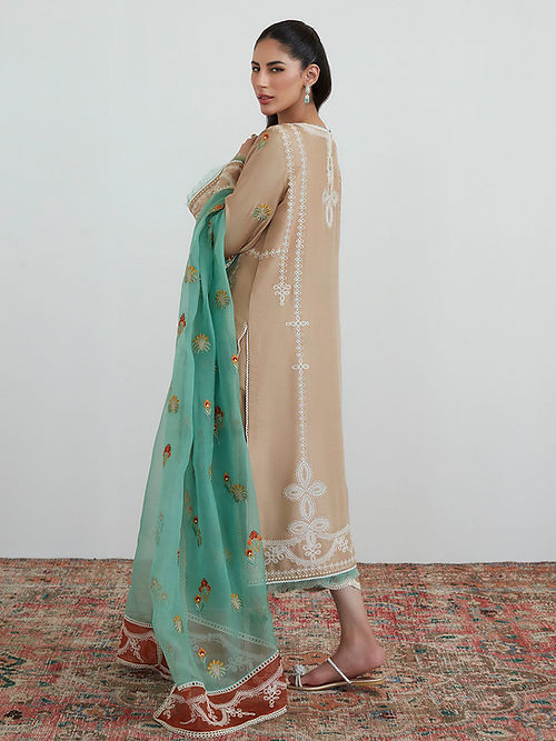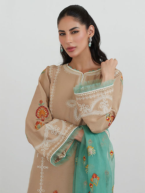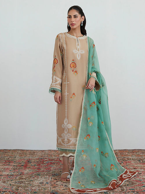A muted shade of beige raw silk is adorned with stunning composed embroidery all over the front, back and sleeves in shades of ivory, rust and red.