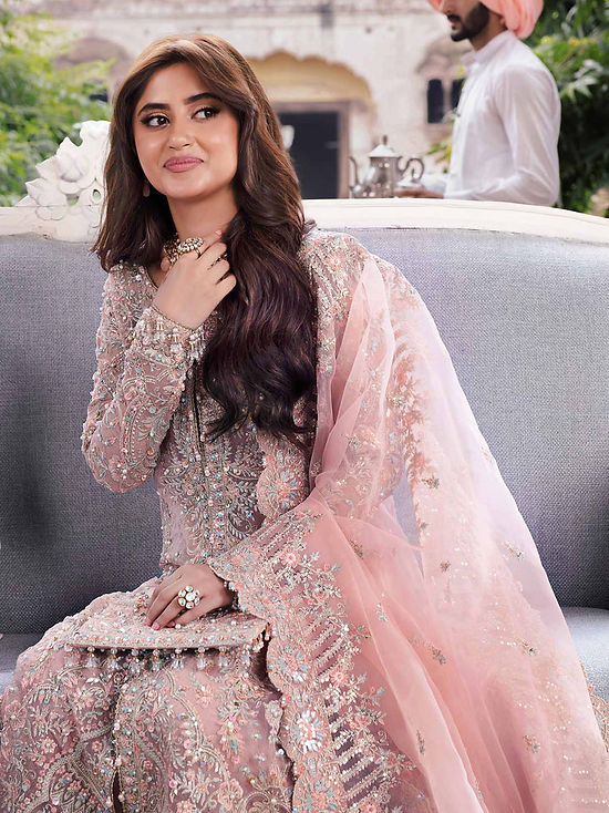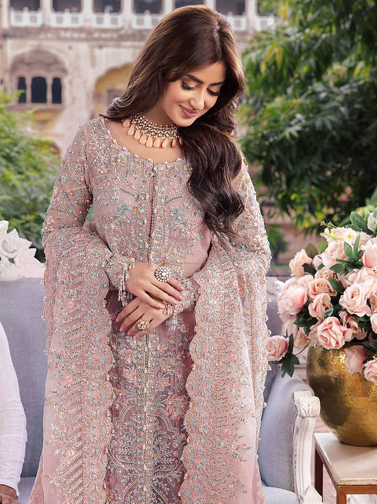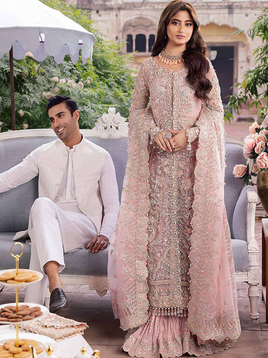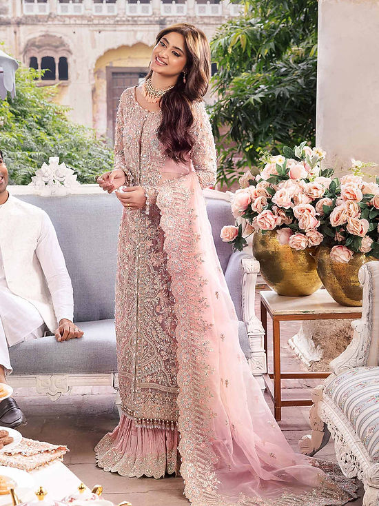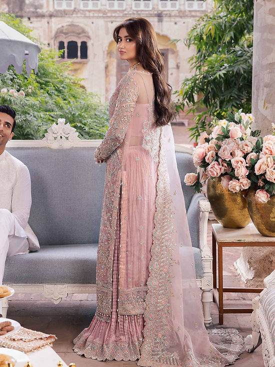 On a flawless light pink canvas, this artfully created piece has embroidered and embellished front. This open front shirt effortlessly captures attention. Elegantly adorned with flowery sequins and handmade accents, along with crushed sharara pants exuding luxury. This embroidered dupatta adds color and festivity, making this grand design one of our favorites in the collection.This outfit exudes grace and sophistication making heads turn. Truly a vision of timeless beauty.