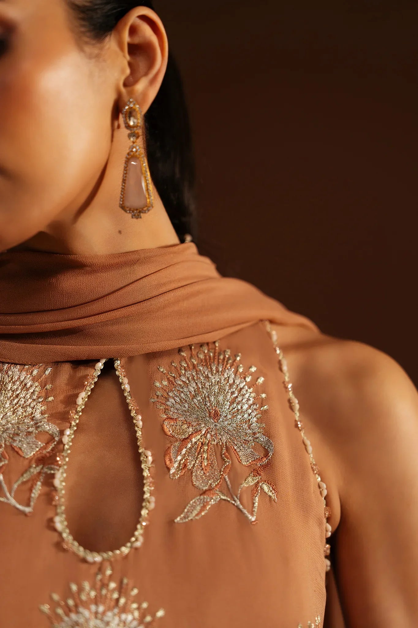 A vision of understated luxury in warm rose-peach, adorned with delicate gold florals that softly shimmer. Effortless elegance flows from a minimalist neckline to an ornate hemline, perfect for evenings of quiet opulence.